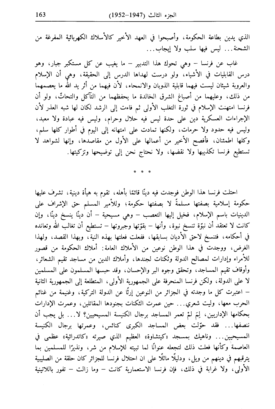 احتلت فرنسا هذا الوطن فوجدت فيه دينًا قائمًا بأهله، تقوم به هيأة دينية، تشرف عليها حكومة إسلامية بصفتها مسلمةً لا بصفتها حكومة؛ وللأمير المسلم حق الإشراف على الدينيات باسم الإسلام، فخيل إليها التعصب- وهي مسيحية- أن دينًا ينسخ دينًا، وإن كانت لا تعتقد أن نبؤة تنسخ نبوة، وأنها- بقوّتها وجبروتها- تستطيع أن تغالب الله وتعانده في أحكامه، فتنسخ لاحق الأديان بسابقها، ففعلت فعلتها بهذه النية، وبهذا القصد، ولهذا الغرض، ووجدت في هذا الوطن نوعين من الأملاك العامة: أملاك الحكومة من قصور للأمراء وإدارات لمصالح الدولة وثكنات لجندها، وأملاك الدين من مساجد تقيم الشعائر، وأوقاف تقيم المساجد، وتحقق وجوه البر والإحسان، وقد حبسها المسلمون على المسلمين لا على الدولة، ولكن فرنسا المنحرفة على الجمهورية الأولى، المتطلعة إلى الجمهورية الثانية - اعتبرت كل ما وجدته في الجزائر من النوعين إرثًا عن الدولة التركية، وغنيمة من غنائم الحرب معها، وليت شعري ... حين عمرت الثكنات بجنودها المقاتلين، وعمرت الإدارات بحكامها الإداريين، لِمَ لمْ تعمر المساجد برجال الكنيسة المسيحيين؟ لا ... بل يجب أن ننصفها ... فقد حوّلت بعض المساجد الكبرى كنائس، وعمرتها برجال الكنيسة المسيحيين ... وناهيك بمسجد "كيتشاوة" العظيم الذي صيرته "كاتدرائية" عظمى في العاصمة وكأنها فعلت ذلك لتجعله عنوانًا لما تبيته للإسلام من شر، ونذيرًا للمسلمين بما يترقبهم في دينهم من وبل، ودليلًا ماثلًا على أن احتلال فرنسا للجزائر كان حلقة من الصليبية الأولى، ولا غرابة في ذلك، فإن فرنسا الاستعمارية كانت- وما زالت- تفور باللاتينية