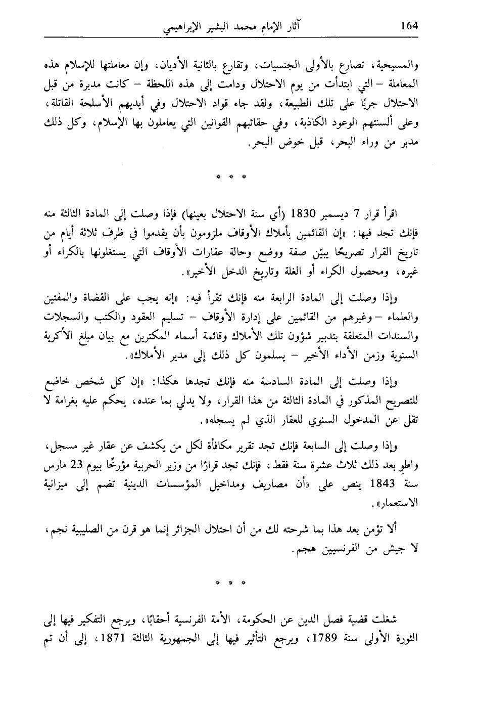 اقرأ قرار 7 ديسمبر 1830 (أي سنة الاحتلال بعينها) فإذا وصلت إلى المادة الثالثة منه فإنك تجد فيها: "إن القائمين بأملاك الأوقاف ملزومون بأن يقدموا في ظرف ثلاثة أيام من تاريخ القرار تصريحًا يبيّن صفة ووضع وحالة عقارات الأوقاف التي يستغلونها بالكراء أو غيره، ومحصول الكراء أو الغلة وتاريخ الدخل الأخير".