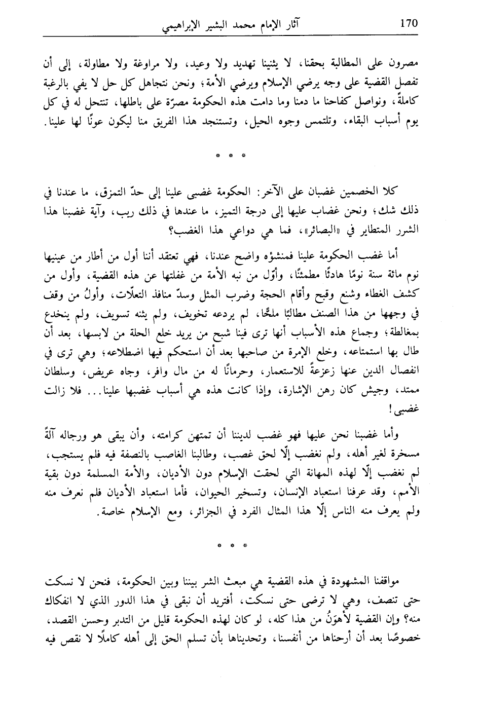 وأما غضبنا نحن عليها فهو غضب لديننا أن تمتهن كرامته، وأن يبقى هو ورجاله آلةً مسخرة لغير أهله، ولم نغضب إلّا لحق غصب، وطالبنا الغاصب بالنصفة فيه فلم يستجب، لم نغضب إلّا لهذه المهانة التي لحقت الإسلام دون الأديان، والأمة المسلمة دون بقية الأمم، وقد عرفنا استعباد الإنسان، وتسخير الحيوان، فأما استعباد الأديان فلم نعرف منه ولم يعرف منه الناس إلّا هذا المثال الفرد في الجزائر، ومع الإسلام خاصة.