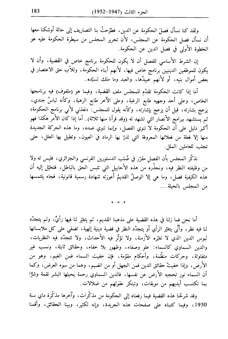 نذكّر المجلس بأن الفصل مقرّر في صُلب الدستورين الفرنسي والجزائري، فليس له ولا من وظيفته النظر فيه، ونحذّره من هذه الأحابيل التي تلبس الحق بالباطل، فتخيّل إليه أن هذه الكيفية فصل، وما هي إلا الوصل القديم أعوزته شهادة رسمية قانونية، فجاء يلتمسها من المجلس بالحيلة ...