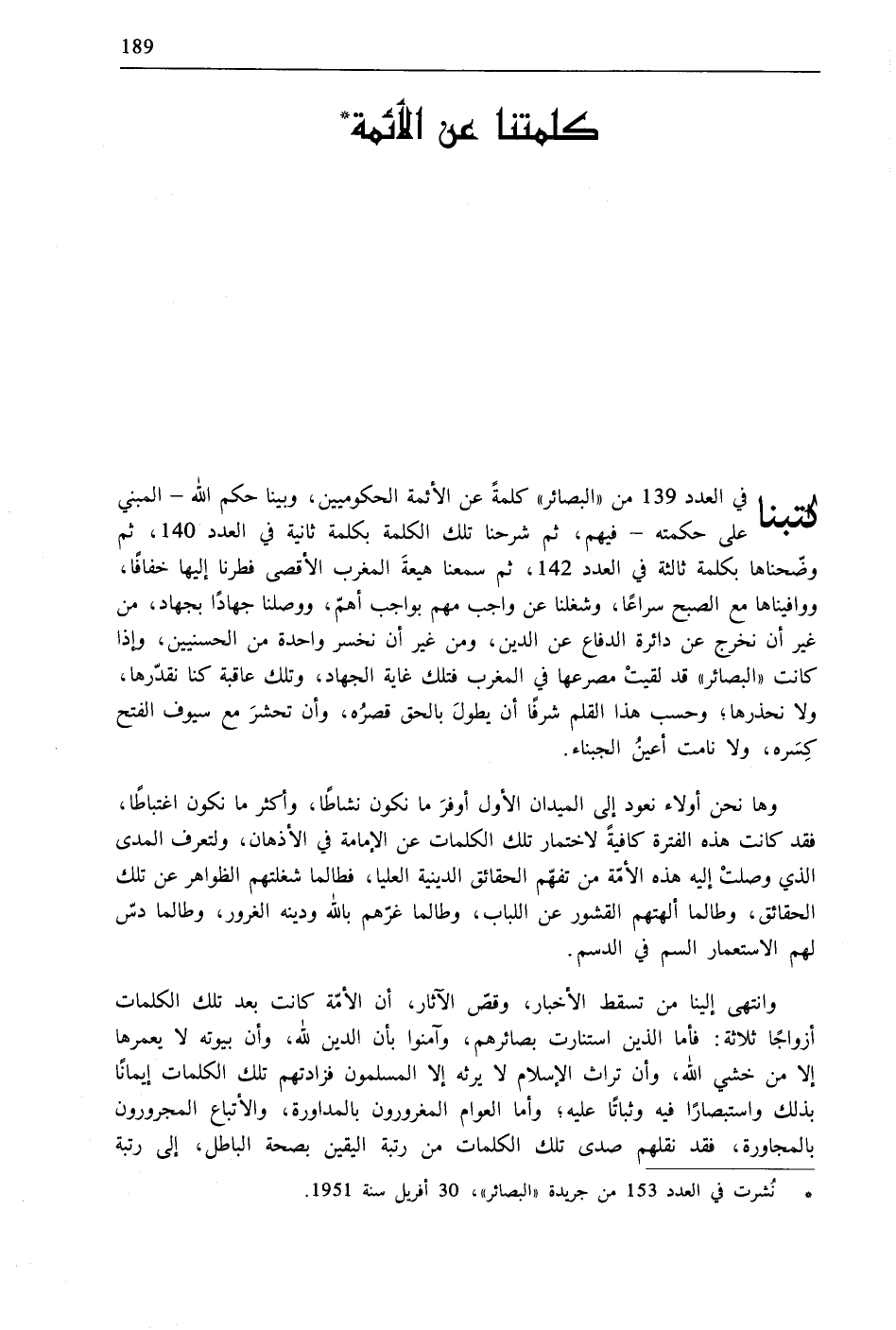 كتبنا في العدد 139 من «البصائر» كلمةً عن الأئمة الحكوميين، وبينا حكم الله- المبني على حكمته- فيهم، ثم شرحنا تلك الكلمة بكلمة ثانية في العدد 140، ثم وضّحناها بكلمة ثالثة في العدد 142، ثم سمعنا هيعةَ المغرب الأقصى فطرنا إليها خفافًا، ووافيناها مع الصبح سراعًا، وشغلنا عن واجب مهم بواجب أهمّ، ووصلنا جهادًا بجهاد، من غير أن نخرج عن دائرة الدفاع عن الدين، ومن غير أن نخسر واحدة من الحسنيين، وإذا كانت «البصائر» قد لقيتْ مصرعها في المغرب فتلك غاية الجهاد، وتلك عاقبة كنا نقدّرها، ولا نحذرها؛ وحسب هذا القلم شرفًا أن يطولَ بالحق قصرُه، وأن تحشرَ مع سيوف الفتح كِسَره، ولا نامت أعينُ الجبناء.