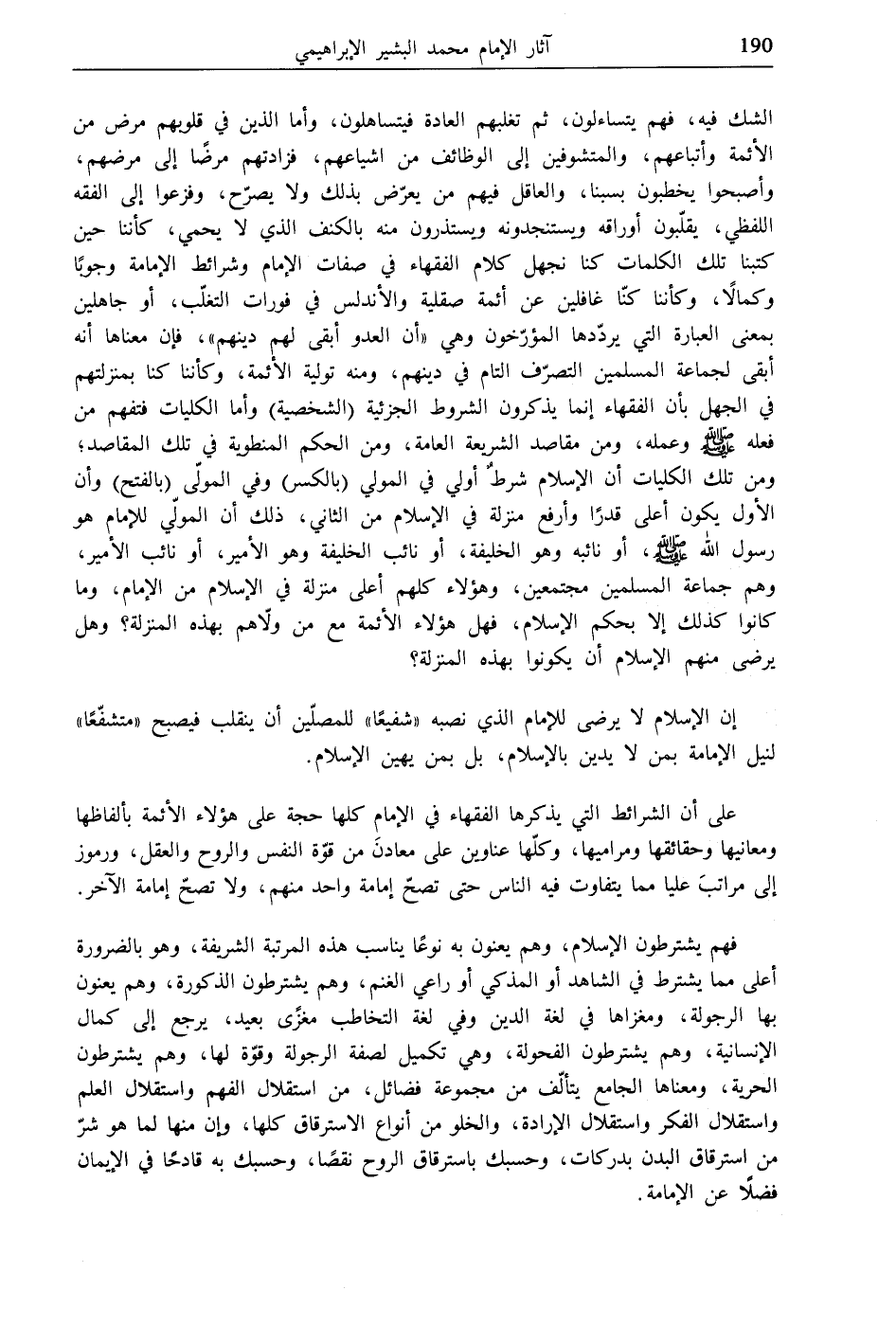 فهم يشترطون الإسلام، وهم يعنون به نوعًا يناسب هذه المرتبة الشريفة، وهو بالضرورة أعلى مما يشترط في الشاهد أو المذكي أو راعي الغنم، وهم يشترطون الذكورة، وهم يعنون بها الرجولة، ومغزاها في لغة الدين وفي لغة التخاطب مغزًى بعيد، يرجع إلى كمال الإنسانية، وهم يشترطون الفحولة، وهي تكميل لصفة الرجولة وقوّة لها، وهم يشترطون الحرية، ومعناها الجامع يتألّف من مجموعة فضائل، من استقلال الفهم واستقلال العلم واستقلال الفكر واستقلال الإرادة، والخلو من أنواع الاسترقاق كلها، وإن منها لما هو شرّ من استرقاق البدن بدركات، وحسبك باسترقاق الروح نقصًا، وحسبك به قادحًا في الإيمان فضلًا عن الإمامة.