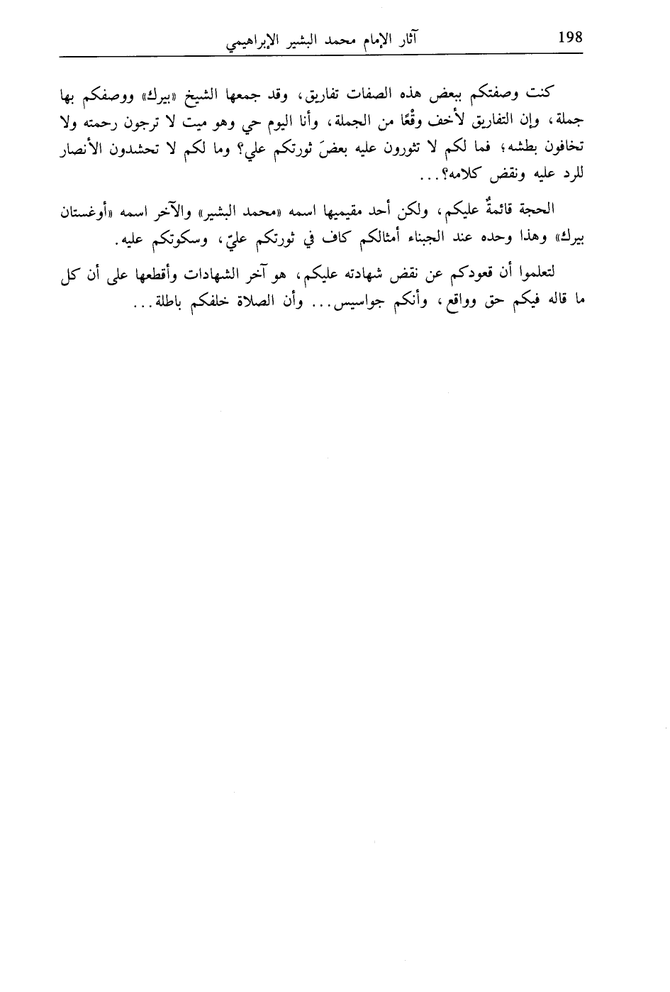 الحجة قائمةٌ عليكم، ولكن أحد مقيميها اسمه "محمد البشير" والآخر اسمه "أوغستان بيرك " وهذا وحده عند الجبناء أمثالكم كاف في ثورتكم عليّ، وسكوتكم عليه.