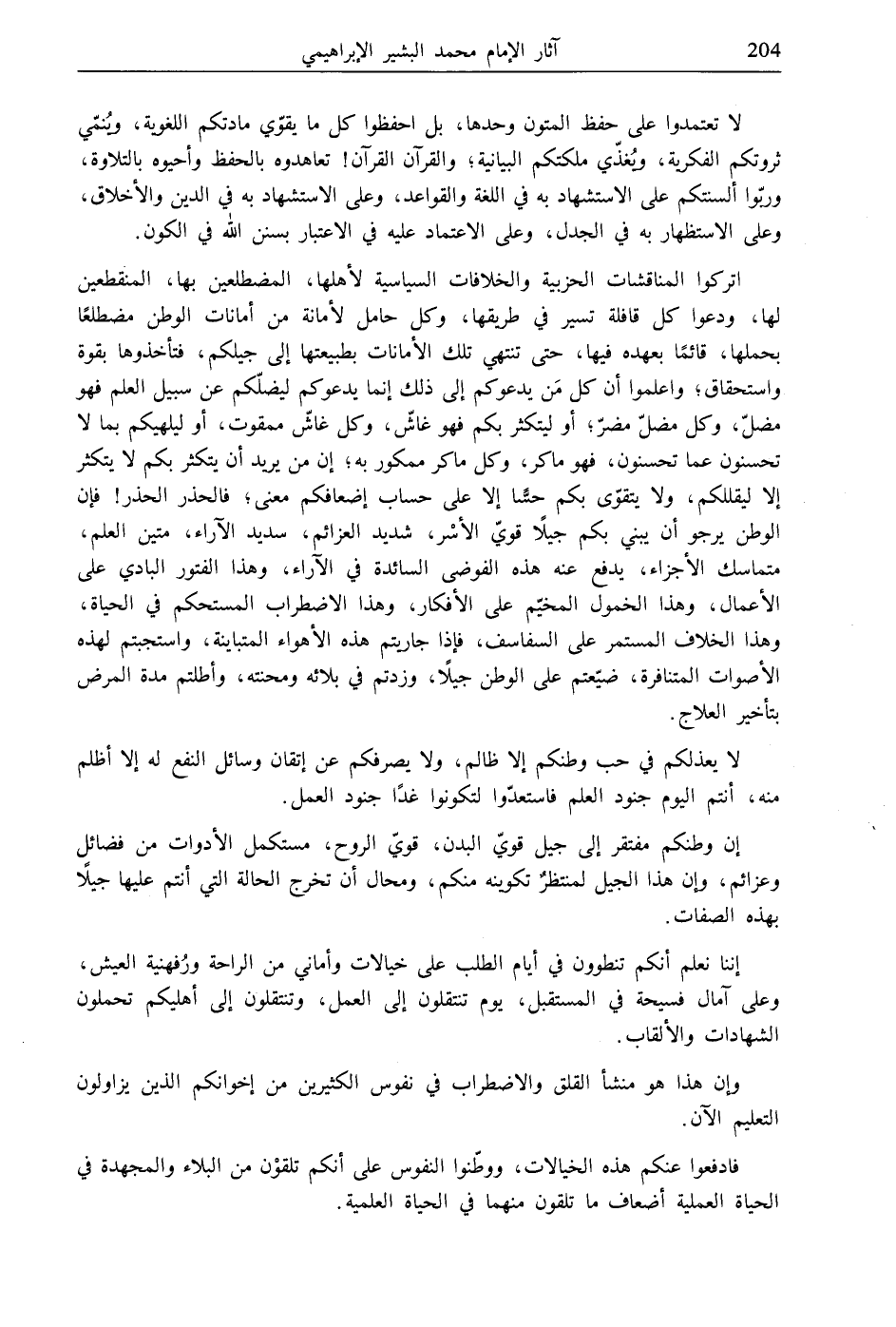 اتركوا المناقشات الحزبية والخلافات السياسية لأهلها، المضطلعين بها، المنقطعين لها، ودعوا كل قافلة تسير في طريقها، وكل حامل لأمانة من أمانات الوطن مضطلعًا بحملها، قائمًا بعهده فيها، حتى تنتهي تلك الأمانات بطبيعتها إلى جيلكم، فتأخذوها بقوة واستحقاق، واعلموا أن كل مَن يدعوكم إلى ذلك إنما يدعوكم ليضلّكم عن سبيل العلم فهو مضلّ، وكل مضلّ مضرّ؛ أو ليتكثر بكم فهو غاشّ، وكل غاشّ ممقوت، أو ليلهيكم بما لا تحسنون عما تحسنون، فهو ماكر، وكل ماكر ممكور به؛ إن من يريد أن يتكثر بكم لا يتكثر إلا ليقللكم، ولا يتقوّى بكم حسًّا إلا على حساب إضعافكم معنى، فالحذر الحذر! فإن الوطن يرجو أن يبني بكم جيلًا قويّ الأسْر، شديد العزائم، سديد الآراء، متين العلم، متماسك الأجزاء، يدفع عنه هذه الفوضى السائدة في الآراء، وهذا الفتور البادي على الأعمال، وهذا الخمول المخيّم على الأفكار، وهذا الاضطراب المستحكم في الحياة، وهذا الخلاف المستمر على السفاسف، فإذا جاريتم هذه الأهواء المتباينة، واستجبتم لهذه الأصوات المتنافرة، ضيّعتم على الوطن جيلًا، وزدتم في بلائه ومحنته، وأطلتم مدة المرض بتأخير العلاج.