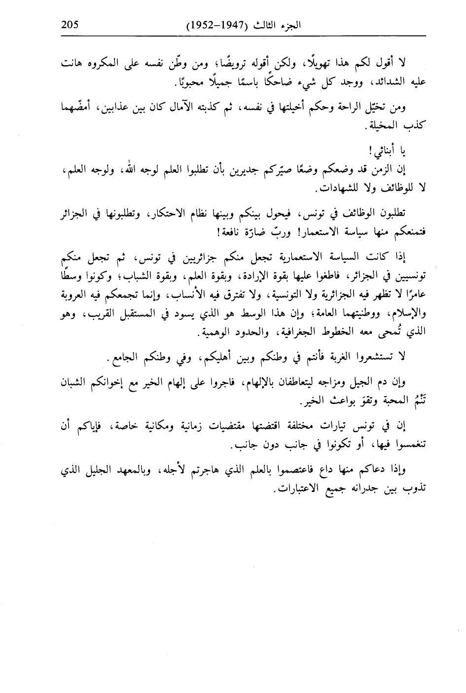 إذا كانت السياسة الاستعمارية تجعل منكم جزائريين في تونس، ثم تجعل منكم تونسيين في الجزائر، فاطغوا عليها بقوة الإرادة، وبقوة العلم، وبقوة الشباب؛ وكونوا وسطًا عامرًا لا تظهر فيه الجزائرية ولا التونسية، ولا تفترق فيه الأنساب، وإنما تجمعكم فيه العروبة والإسلام، ووطنيتهما العامة؛ وإن هذا الوسط هو الذي يسود في المستقبل القريب، وهو الذي تمحى معه الخطوط الجغرافية، والحدود الوهمية.