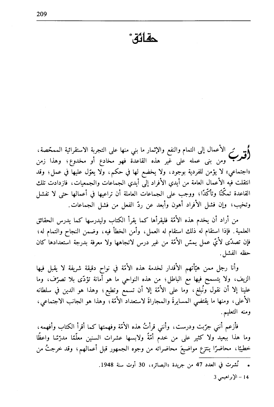 * نُشرت في العدد 47 من جريدة «البصائر»، 30 أوت سنة 1948.