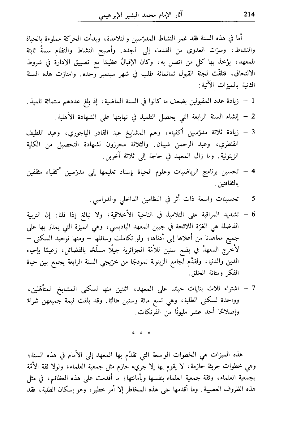 هذه الميزات هي الخطوات الواسعة التي تقدّم بها المعهد إلى الأمام في هذه السنة، وهي خطوات جريئة حازمة، لا يقوم بها إلا جريء حازم مثل جمعية العلماء، ولولا ثقة الأمّة بجمعية العلماء، وثقة جمعية العلماء بنفسها وبأمانتها، ما أقدمت على هذه العظائم، في مثل هذه الظروف العصيبة. وما أقدمها على هذه المخاطر إلا أمر خطير، وهو إسكان الطلبة، فقد