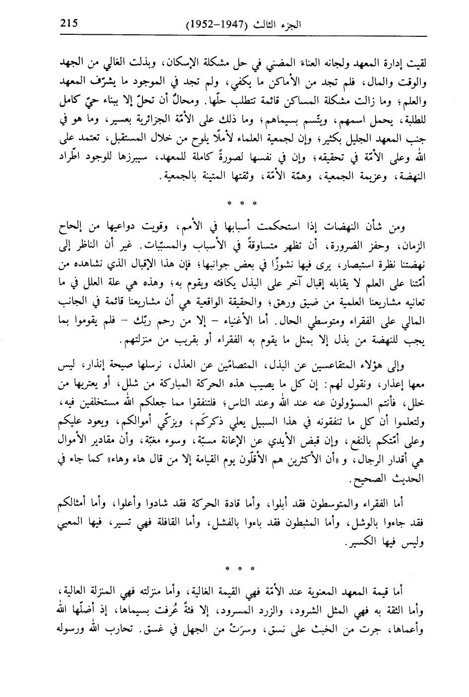 لقيت إدارة المعهد ولجانه العناءَ المضني في حل مشكلة الإسكان، وبذلت الغالي من الجهد والوقت والمال، فلم تجد من الأماكن ما يكفي، ولم تجد في الموجود ما يشرّف المعهد والعلم، وما زالت مشكلة المساكن قائمة تتطلب حلّها. ومحالٌ أن تحلّ إلا ببناء حيّ كامل للطلبة، يحمل اسمهم، ويتّسم بسيماهم؛ وما ذلك على الأمّة الجزائرية بعسير، وما هو في جنب المعهد الجليل بكثير، وإن لجمعية العلماء لأملًا يلوح من خلال المستقبل، تعتمد على الله وعلى الأمّة في تحقيقه، وإن في نفسها لصورةً كاملة للمعهد، سيبرزها للوجود اطّراد النهضة، وعزيمة الجمعية، وهمّة الأمّة، وثقتها المتينة بالجمعية.