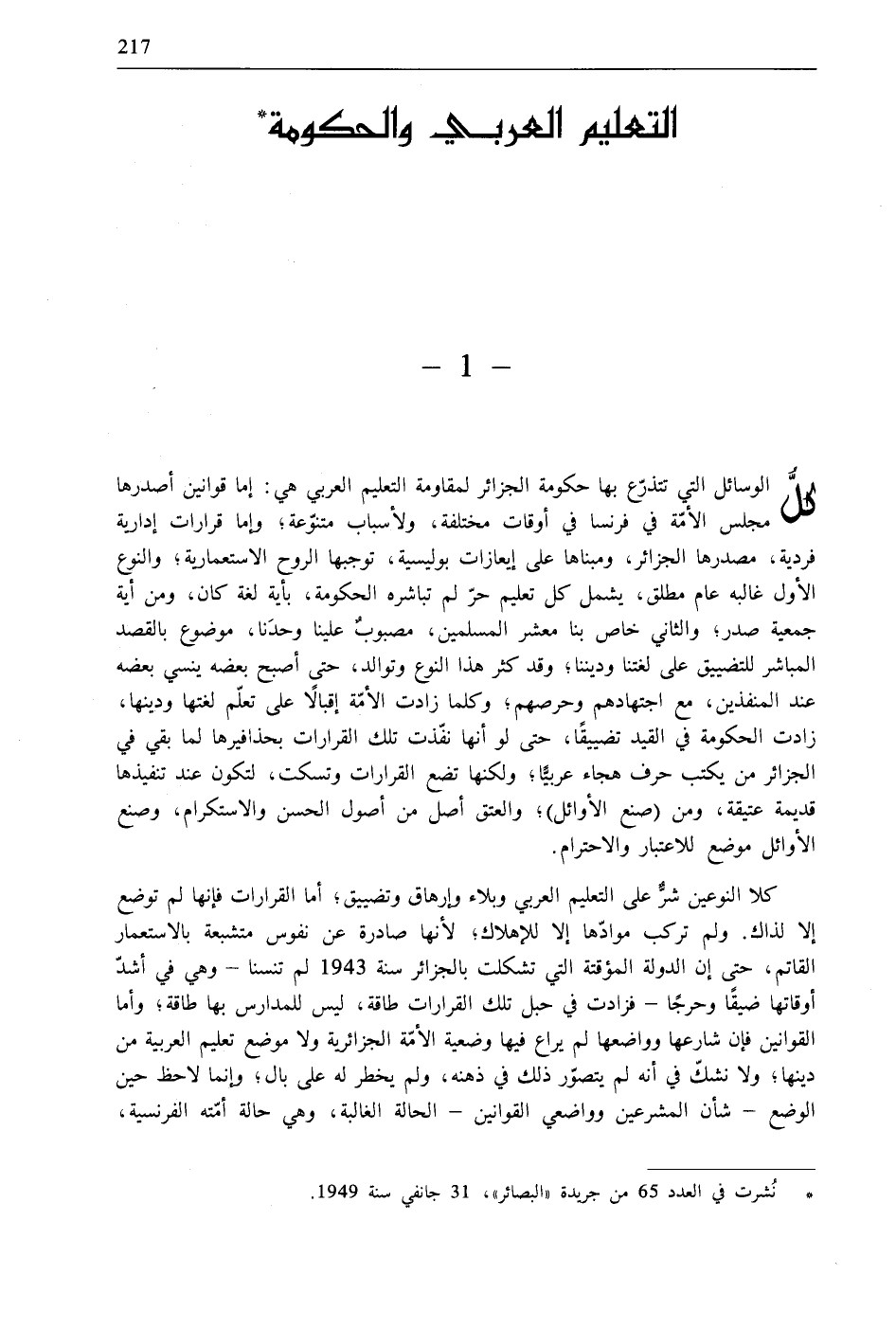 كلُّ الوسائل التي تتذرعّ بها حكومة الجزائر لمقاومة التعليم العربي هي: إما قوانين أصدرها مجلس الأمّة في فرنسا في أوقات مختلفة، ولأسباب متنوّعة، وإما قرارات إدارية فردية، مصدرها الجزائر، ومبناها على إيعازات بوليسية، توجبها الروح الاستعمارية، والنوع الأول غالبه عام مطلق، يشمل كل تعليم حرّ لم تباشره الحكومة، بأية لغة كان، ومن أية جمعية صدر، والثاني خاص بنا معشر المسلمين، مصبوبٌ علينا وحدَنا، موضوع بالقصد المباشر للتضييق على لغتنا وديننا، وقد كثر هذا النوع وتوالد، حتى أصبح بعضه ينسي بعضه عند المنفذين، مع اجتهادهم وحرصهم، وكلما زادت الأمّة إقبالًا على تعلّم لغتها ودينها، زادت الحكومة في القيد تضييقًا، حتى لو أنها نفّذت تلك القرارات بحذافيرها لما بقي في الجزائر من يكتب حرف هجاء عربيًّا، ولكنها تضع القرارات وتسكت، لتكون عند تنفيذها قديمة عتيقة، ومن (صنع الأوائل)؛ والعتق أصل من أصول الحسن والاستكرام، وصنع الأوائل موضع للاعتبار والاحترام.