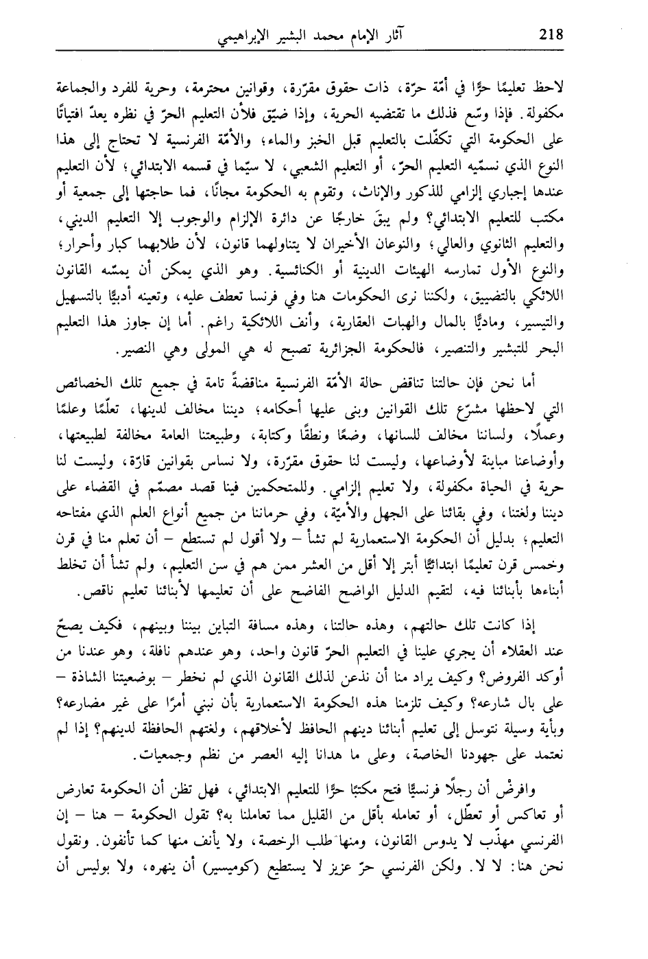 أما نحن فإن حالتنا تناقض حالة الأمّة الفرنسية مناقضةً تامة في جميع تلك الخصائص التي لاحظها مشرّع تلك القوانين وبنى عليها أحكامه؛ ديننا مخالف لدينها، تعلّمًا وعلمًا وعملًا، ولساننا مخالف للسانها، وضعًا ونطقًا وكتابة، وطبيعتنا العامة مخالفة لطبيعتها، وأوضاعنا مباينة لأوضاعها، وليست لنا حقوق مقرّرة، ولا نساس بقوانين قارّة، وليست لنا حرية في الحياة مكفولة، ولا تعليم إلزامي. وللمتحكمين فينا قصد مصمّم في القضاء على ديننا ولغتنا، وفي بقائنا على الجهل والأميّة، وفي حرماننا من جميع أنواع العلم الذي مفتاحه التعليم، بدليل أن الحكومة الاستعمارية لم تشأ- ولا أقول لم تستطع- أن تعلم منا في قرن وخمس قرن تعليمًا ابتدائيًّا أبتر إلا أقل من العشر ممن هم في سن التعليم، ولم تشأ أن تخلط أبناءها بأبنائنا فيه، لتقيم الدليل الواضح الفاضح على أن تعليمها لأبنائنا تعليم ناقص.