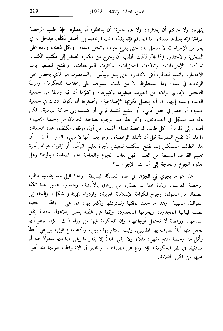 هذا هو ما يجري في الجزائر في هذه المسألة البسيطة، وهذا قليل مما يقاسيه طالب الرخصة المسلم، زيادة عما لم نصوّره من إرهاق بالأسئلة، وحساب عسير عما تكنه الضمائر من الميول، وجرح للكرامة الإسلامية العربية، وازدراء للهيئة والشكل، وإلجاء إلى المواقف المهينة. وهذا ما جعلنا نمقتها ونسترذلها ونكفر بها، فما هي- والله- رخصة تطلب فينالها المجدود، ويحرمها المحدود، وإنما هي غضة يعسر ابتلاعها، وقصة يثقل سماعها، ورهصة لا تحتمل أوجاعها؛ وإن للحكومة فيها من وراء ذلك لسرًّا، وهو أنها تجعل منها أداة تصرف بها الطالبين. وليت المتاع بها طويل، ولكنه متاع قليل، بل هي أحط وأقل من رخصة "فتح مقهى" مثلًا؛ ولا تبقى نافذةً إلا بقدر ما يبقى صاحبها مغفولًا عنه أو مستقيمًا في نظر الحكومة؛ فإذا زاغ عن الصراط، أو قصر في الاشتراط، فنزعها منه أهون عليها من قصّ القلامة.