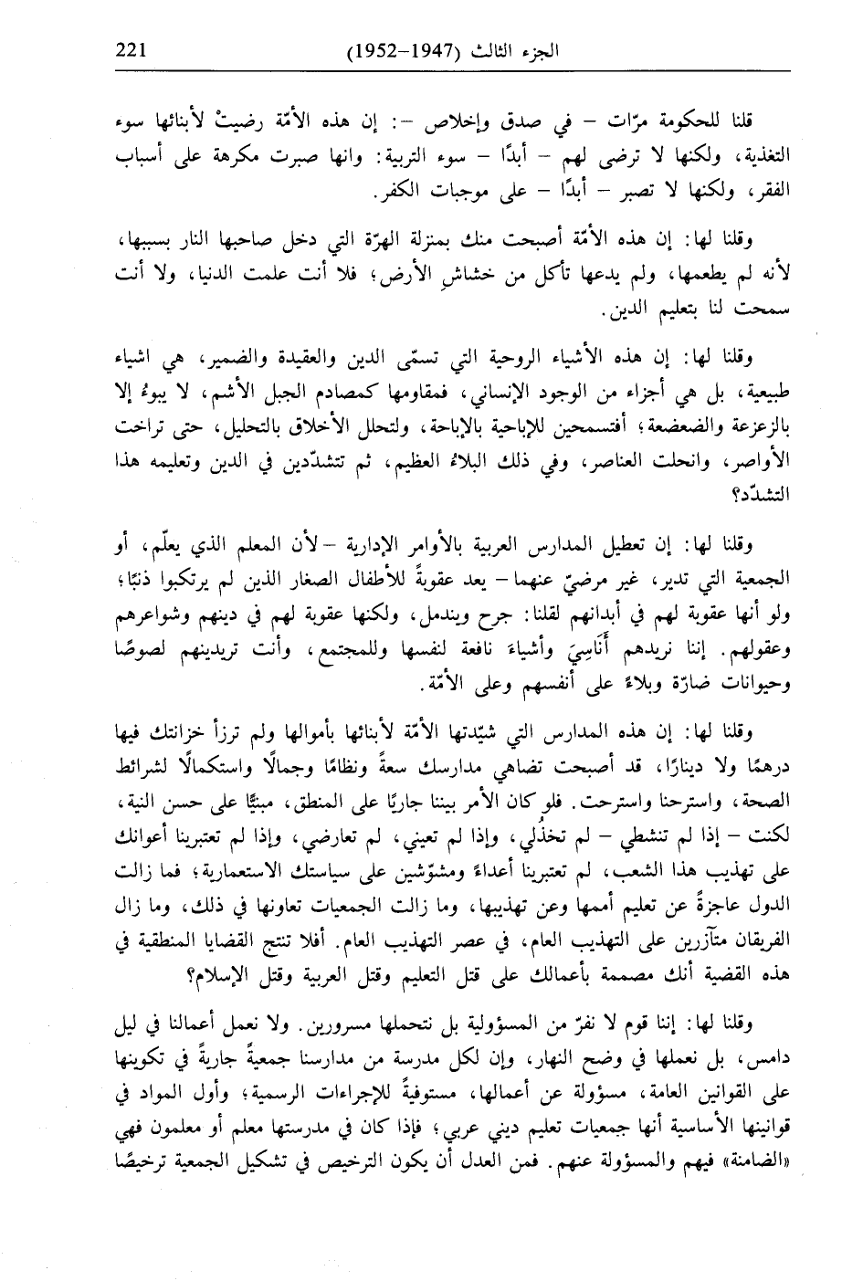 وقلنا لها: إننا قوم لا نفرّ من المسؤولية بل نتحملها مسرورين. ولا نعمل أعمالنا في ليل دامس، بل نعملها في وضح النهار، وإن لكل مدرسة من مدارسنا جمعيةً جاريةً في تكوينها على القوانين العامة، مسؤولة عن أعمالها، مستوفيةً للإجراءات الرسمية، وأول المواد في قوانينها الأساسية أنها جمعيات تعليم ديني عربي؛ فإذا كان في مدرستها معلم أو معلمون فهي "الضامنة" فيهم والمسؤولة عنهم. فمن العدل أن يكون الترخيص في تشكيل الجمعية ترخيصًا