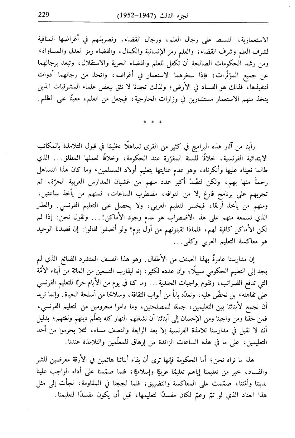 إن مدارسنا عامرةٌ بهذا الصنف من الأطفال. وهو هذا الصنف المتشرد الضائع الذي لم يجد إلى التعليم الحكومي سبيلًا؛ وان عدده لكثير، إنه ليقارب التسعين من المائة من أبناء الأمّة التي تدفع الضرائب، وتقوم بواجبات الجندية ... وما كنا في يوم من الأيام حربًا للتعليم الفرنسي على تفاهته؛ بل نحضّ عليه، ونعدّه باباً من أبواب الثقافة، وسلاحًا من أسلحة الحياة. وإنما نريد أن نجمع لأبنائنا بين التعليمين، جمعًا للمصلحتين، وما داموا محرومين من التعليم الفرنسي، فمن حقنا ومن واجبنا ومن الإحسان إلى أبنائنا أن نشغلهم النهار كله بتعلّم دينهم ولغتهم؛ بدليل أننا لا نقبل في مدارسنا تلامذة الفرنسية إلا بعد الرابعة والنصف مساء، لئلا يحرموا من أحد التعليمين، على ما في هذه الساعات الزائدة من إرهاق للمعلّمين والتلامذة عندنا.
