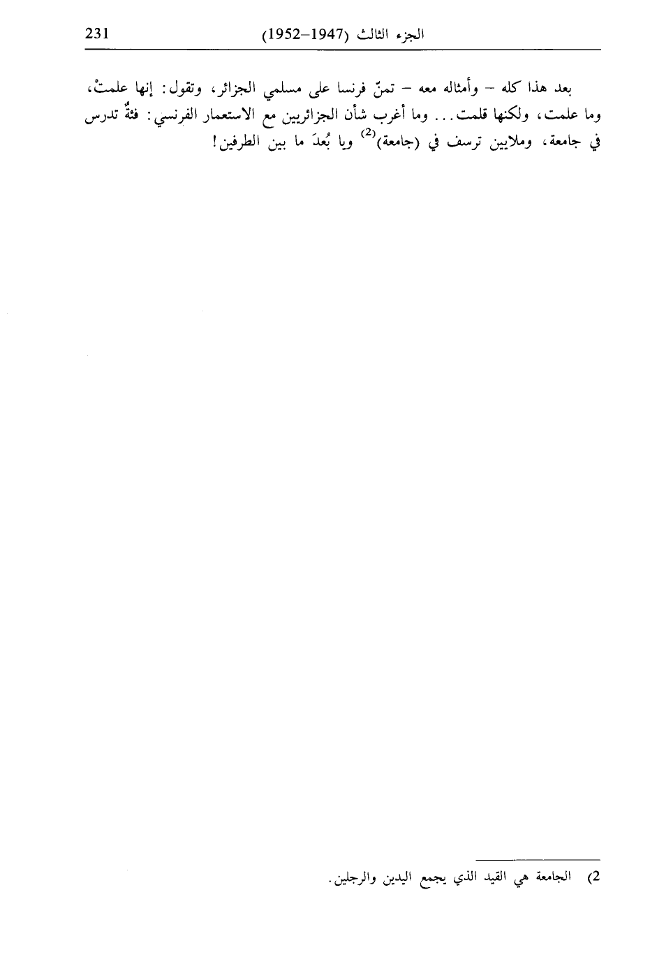 بعد هذا كله- وأمثاله معه- تمنّ فرنسا على مسلمي الجزائر، وتقول: إنها علمتْ، وما علمت، ولكنها قلمت ... وما أغرب شأن الجزائريين مع الاستعمار الفرنسي: فئةٌ تدرس في جامعة، وملايين ترسف في (جامعة) (2) ويا بُعدَ ما بين الطرفين!