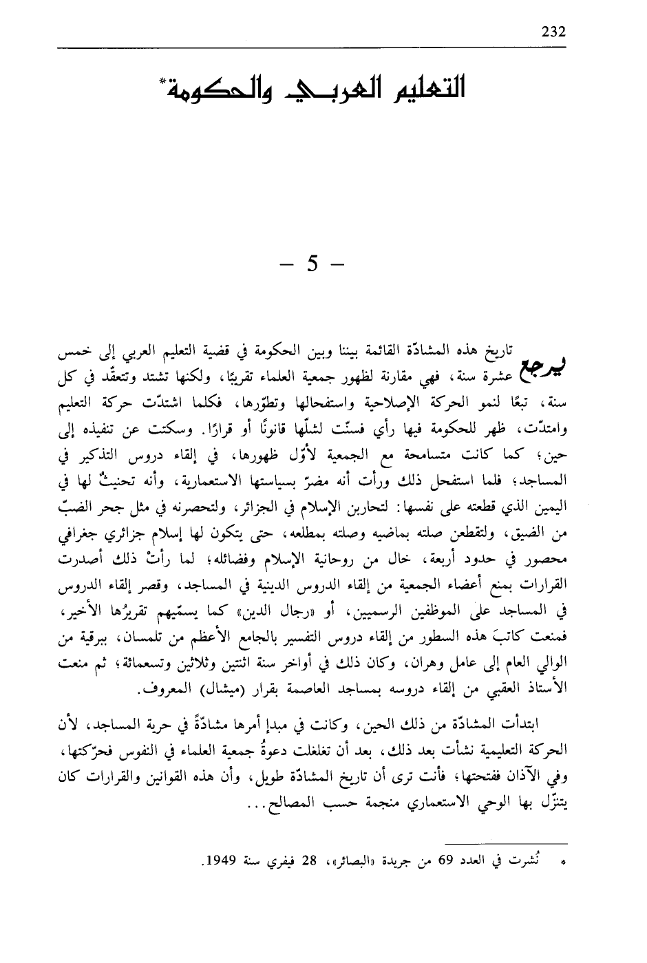 يرجع تاريخ هذه المشادّة القائمة بيننا وبين الحكومة في قضية التعليم العربي إلى خمس عشرة سنة، فهي مقارنة لظهور جمعية العلماء تقريبًا، ولكنها تشتد وتتعقّد في كل سنة، تبعًا لنمو الحركة الإصلاحية واستفحالها وتطوّرها، فكلما اشتدّت حركة التعليم وامتدّت، ظهر للحكومة فيها رأي فسنّت لشلّها قانونًا أو قرارًا. وسكتت عن تنفيذه إلى حين؛ كما كانت متسامحة مع الجمعية لأوّل ظهورها، في إلقاء دروس التذكير في المساجد؛ فلما استفحل ذلك ورأت أنه مضرّ بسياستها الاستعمارية، وأنه تحنيثٌ لها في اليمين الذي قطعته على نفسها: لتحاربن الإسلام في الجزائر، ولتحصرنه في مثل جحر الضبّ من الضيق، ولتقطعن صلته بماضيه وصلته بمطلعه، حتى يتكون لها إسلام جزائري جغرافي محصور في حدود أربعة، خال من روحانية الإسلام وفضائله، لما رأتْ ذلك أصدرت القرارات بمنع أعضاء الجمعية من إلقاء الدروس الدينية في المساجد، وقصر إلقاء الدروس في المساجد على الموظفين الرسميين، أو "رجال الدين" كما يسمّيهم تقريرها الأخير، فمنعت كاتبَ هذه السطور من إلقاء دروس التفسير بالجامع الأعظم من تلمسان، ببرقية من الوالي العام إلى عامل وهران، وكان ذلك في أواخر سنة اثنتين وثلاثين وتسعمائة؛ ثم منعت الأستاذ العقبي من إلقاء دروسه بمساجد العاصمة بقرار (ميشال) المعروف.