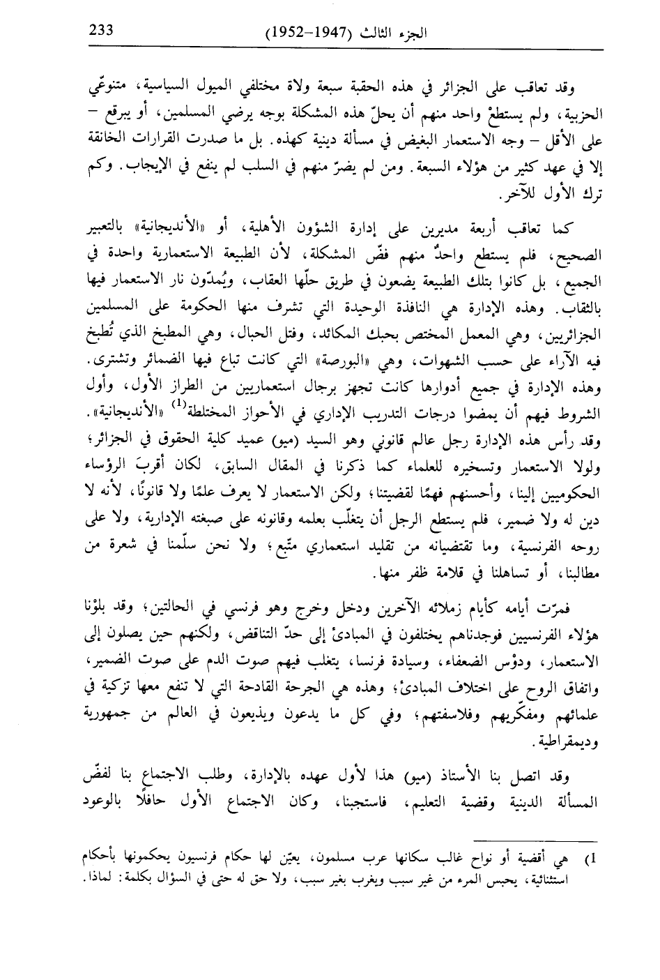 كما تعاقب أربعة مديرين على إدارة الشؤون الأهلية، أو "الأنديجانية" بالتعبير الصحيح، فلم يستطع واحدٌ منهم فضّ المشكلة، لأن الطبيعة الاستعمارية واحدة في الجميع، بل كانوا بتلك الطبيعة يضعون في طريق حلّها العقاب، ويُمدّون نار الاستعمار فيها بالثقاب. وهذه الإدارة هي النافذة الوحيدة التي تشرف منها الحكومة على المسلمين الجزائريين، وهي المعمل المختص بحبك المكائد، وفتل الحبال، وهي المطبخ الذي تُطبخ فيه الآراء على حسب الشهوات، وهي "البورصة" التي كانت تباع فيها الضمائر وتشترى. وهذه الإدارة في جميع أدوارها كانت تجهز برجال استعماريين من الطراز الأول، وأول الشروط فيهم أن يمضوا درجات التدريب الإداري في الأحواز المختلطة (1) "الأنديجانية". وقد رأس هذه الإدارة رجل عالم قانوني وهو السيد (ميو) عميد كلية الحقوق في الجزائر، ولولا الاستعمار وتسخيره للعلماء كما ذكرنا في المقال السابق، لكان أقربَ الرؤساء الحكوميين إلينا، وأحسنهم فهمًا لقضيتنا، ولكن الاستعمار لا يعرف علمًا ولا قانونًا، لأنه لا دين له ولا ضمير، فلم يستطع الرجل أن يتغلّب بعلمه وقانونه على صبغته الإدارية، ولا على روحه الفرنسية، وما تقتضيانه من تقليد استعماري متّبع، ولا نحن سلّمنا في شعرة من مطالبنا، أو تساهلنا في قلامة ظفر منها.