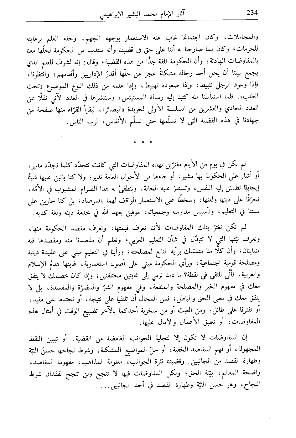لم نكن في يوم من الأيام مغترّين بهذه المفاوضات التي كانت تتجدّد كلما تجدّد مدير، أو أشار على الحكومة بها مشير، أو جاءها من الأحوال العامة نذير؛ ولا كنا بانين عليها شيئًا إيجابيًّا تطمئن إليه النفس، وتستقرّ عليه الحالة، وينطفئ به هذا الضرام المشبوب في الأمّة، تحرّقًا على دينها ولغتها، وسخطًا على الاستعمار الواقف لهما بالمرصاد؛ بل كنا جارين على سنتنا في التعليم، وتأسيس مدارسه وجمعياته، موفين بعهد الله في خدمة دينه ولغة كتابه.