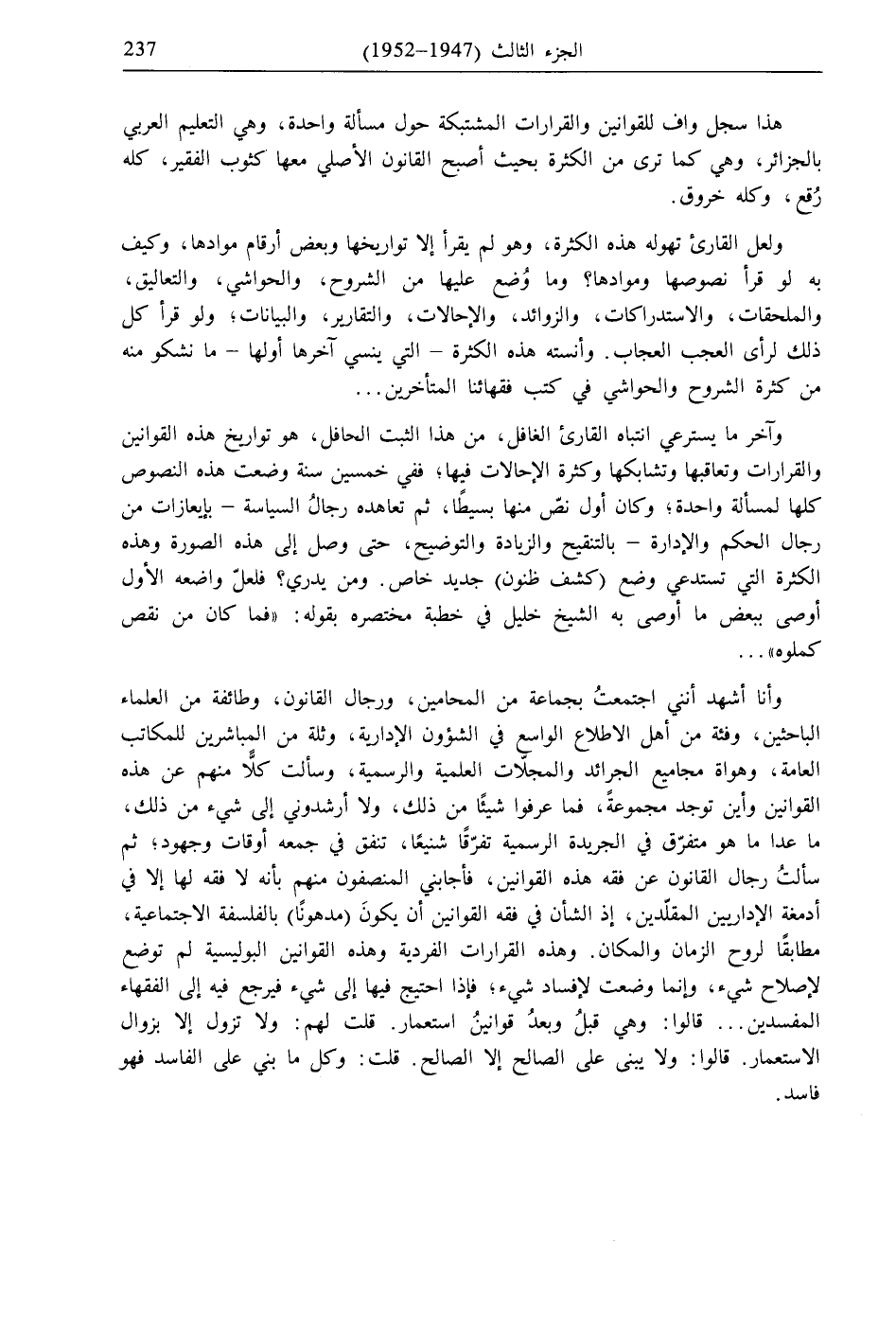 وأنا أشهد أنني اجتمعتُ بجماعة من المحامين، ورجال القانون، وطائفة من العلماء الباحثين، وفئة من أهل الاطلاع الواسع في الشؤون الإدارية، وثلة من المباشرين للمكاتب العامة، وهواة مجاميع الجرائد والمجلّات العلمية والرسمية، وسألت كلًّا منهم عن هذه القوانين وأين توجد مجموعةً، فما عرفوا شيئًا من ذلك، ولا أرشدوني إلى شيء من ذلك، ما عدا ما هو متفرّق في الجريدة الرسمية تفرّقًا شنيعًا، تنفق في جمعه أوقات وجهود، ثم سألت رجال القانون عن فقه هذه القوانين، فأجابني المنصفون منهم بأنه لا فقه لها إلا في أدمغة الإداريين المقلّدين، إذ الشأن في فقه القوانين أن يكونَ (مدهونًا) بالفلسفة الاجتماعية، مطابقًا لروح الزمان والمكان. وهذه القرارات الفردية وهذه القوانين البوليسية لم توضع لإصلاح شيء، وانما وضعت لإفساد شيء، فإذا احتيج فيها إلى شيء فيرجع فيه إلى الفقهاء المفسدين ... قالوا: وهي قبلُ وبعدُ قوانينُ استعمار. قلت لهم: ولا تزول إلا بزوال الاستعمار. قالوا: ولا يبنى على الصالح إلا الصالح. قلت: وكل ما بني على الفاسد فهو فاسد.