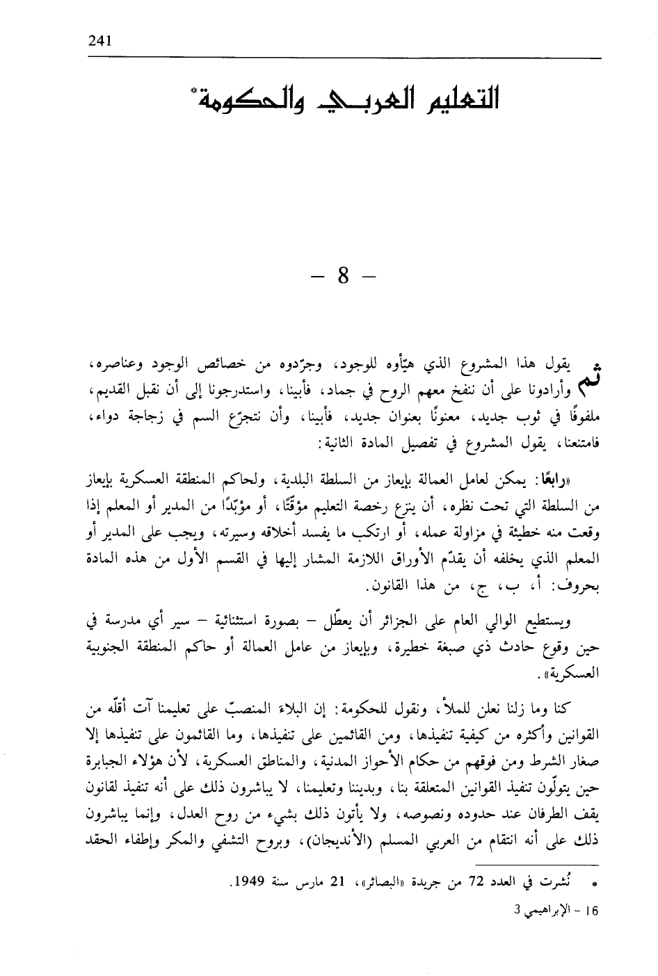 * نُشرت في العدد 72 من جريدة «البصائر»، 21 مارس سنة 1949.