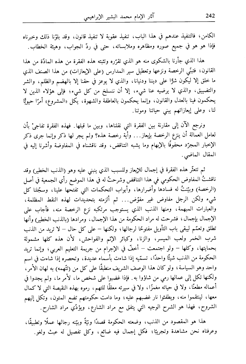 ثم تتعثّر هذه الفقرة في إجمال للإيعاز وللسبب الذي ينبني عليه وهو (الذنب الخطير) وقد ناقشت المفاوض الحكومي في هذا التناقض وشرحت له في هذا الموضع رأي الجمعية في أصل (الرخصة) وبيّنت له فسادها وأضرارها، وأبواب التحكمات التي تفتحها علينا، وسجّلنا كل شيء ولكن الرجل مفاوض غير مفوّض ... ثم ألزمته بتحديدات لهذه النقط المظلمة، والعبارات المبهمة، ومنها الذنب الذي يستوجب مرتكبه نزع الرخصة منه، فأجاب على الإجمال بإجمال، فشرحت له مراد الحكومة من هذا الإجمال، ومرادها (بالذنب الخطير) وأنها تطلق وتعمّم ليبقى باب التأويل مفتوحًا لرجالها، ولكنها- على كل حال- لا تريد من الذنب شرب الخمر ولعب الميسر، والزنا، وكبائر الإثم والفواحش، لأن هذه كلها مشمولة بحمايتها، وكلها- ولو اجتمعت- أخفّ في الإجرام من جريمة التعليم العربي، وإنما تريد الحكومة من الذنب شيئًا واحدًا، تسمّيه إذا شاءت بأسماء عديدة، وتحصره إذا شاءت في اسم واحد وهو السياسة، ولو كان هذا الوصف الشريف منطبقًا على كل من (تتّهمه) به لهان الأمر، ولكنها تكل إلى عمالها رمي من شاؤوا به. فإذا غضبوا على شخص ما، لأمر ما، ولم يجدوا في أعماله مطعنًا، ولا في حياته مغمزًا، ولا في سيرته معلقًا للتهم، رموه بهذه النقيصة التي لا كمال معها، لينتقموا منه، ويطفئوا نار غضبهم عليه، وما دامت حكومتهم تضع المتون، وتكل إليهم الشروح، فهذا هو الشرح الوجيه التي يتفق مع مراد الشارع، ويؤدّي مراد الشارح.