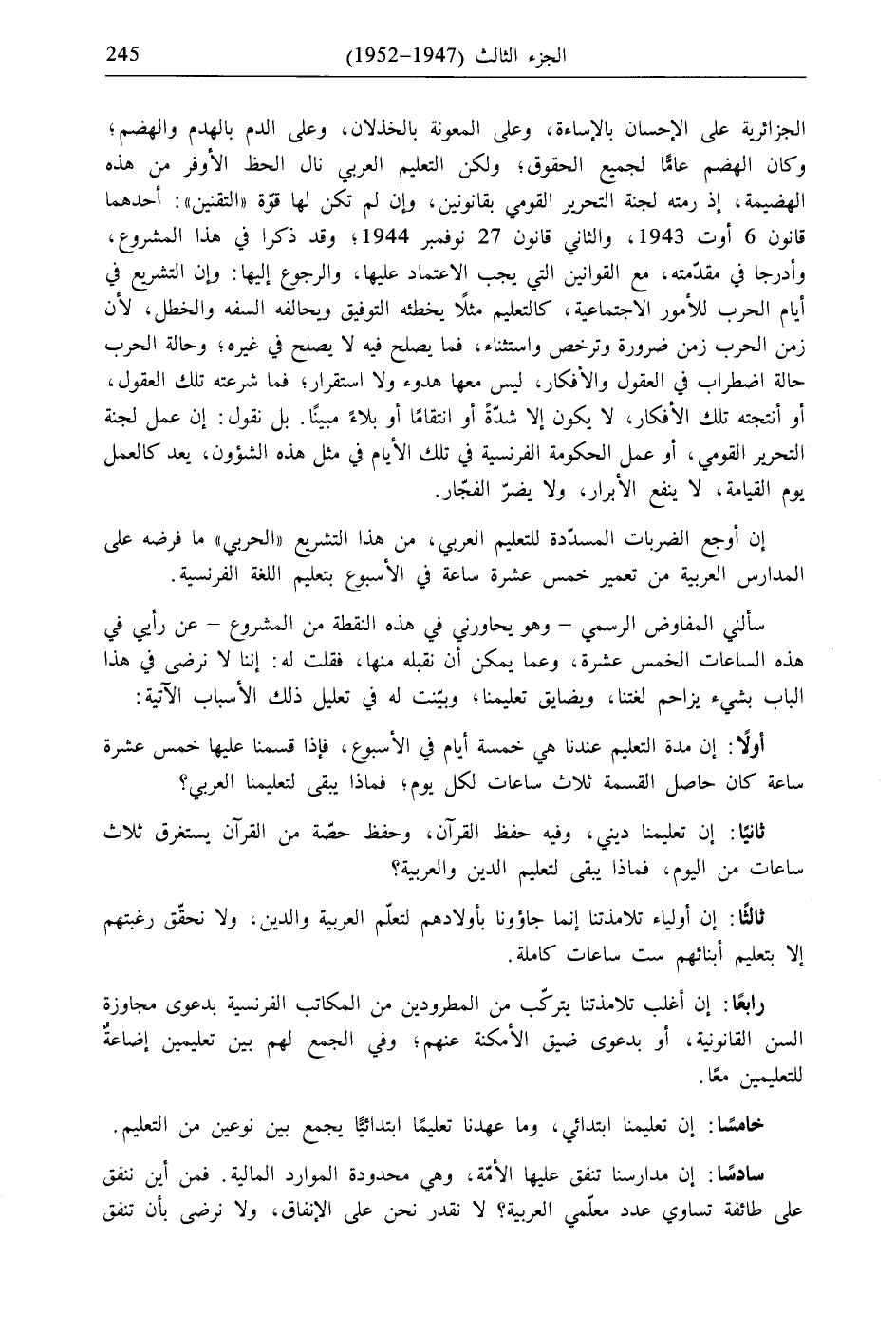 الجزائرية على الإحسان بالإساءة، وعلى المعونة بالخذلان، وعلى الدم بالهدم والهضم؛ وكان الهضم عامًّا لجميع الحقوق، ولكن التعليم العربي نال الحظ الأوفر من هذه الهضيمة، إذ رمته لجنة التحرير القومي بقانونين، وإن لم تكن لها قوّة "التقنين": أحدهما قانون 6 أوت 1943، والثاني قانون 27 نوفمبر 1944؛ وقد ذكرا في هذا المشروع، وأدرجا في مقدّمته، مع القوانين التي يجب الاعتماد عليها، والرجوع إليها: وإن التشريع في أيام الحرب للأمور الاجتماعية، كالتعليم مثلًا يخطئه التوفيق ويحالفه السفه والخطل، لأن زمن الحرب زمن ضرورة وترخص واستثناء، فما يصلح فيه لا يصلح في غيره، وحالة الحرب حالة اضطراب في العقول والأفكار، ليس معها هدوء ولا استقرار، فما شرعته تلك العقول، أو أنتجته تلك الأفكار، لا يكون إلا شدّةً أو انتقامًا أو بلاءً مبينًا. بل نقول: إن عمل لجنة التحرير القومي، أو عمل الحكومة الفرنسية في تلك الأيام في مثل هذه الشؤون، يعد كالعمل يوم القيامة، لا ينفع الأبرار، ولا يضرّ الفجّار.
