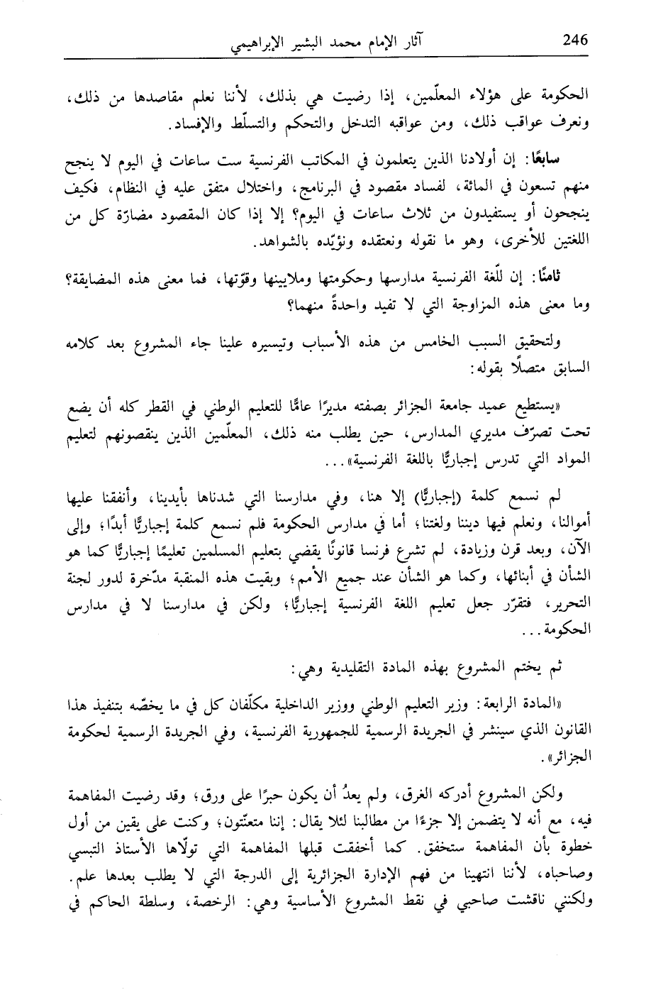 لم نسمع كلمة (إجباريًّا) إلا هنا، وفي مدارسنا التي شدناها بأيدينا، وأنفقنا عليها أموالنا، ونعلم فيها ديننا ولغتنا؛ أما في مدارس الحكومة فلم نسمع كلمة إجباريًّا أبدًا؛ وإلى الآن، وبعد قرن وزيادة، لم تشرع فرنسا قانونًا يقضي بتعليم المسلمين تعليمًا إجباريًّا كما هو الشأن في أبنائها، وكما هو الشأن عند جميع الأمم، وبقيت هذه المنقبة مدّخرة لدور لجنة التحرير، فتقرّر جعل تعليم اللغة الفرنسية إجباريًّا، ولكن في مدارسنا لا في مدارس الحكومة ...