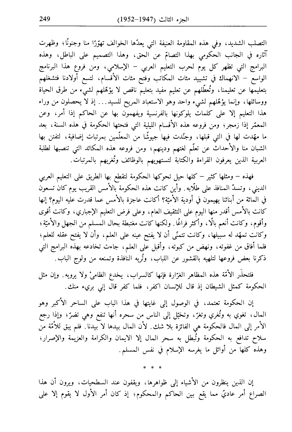 فهذه- ومثلها كثير- كلها حيل تحوكها الحكومة لتقطع بها الطريق على التعليم العربي الديني، وتسدّ المنافذ على طلّابه. وأين كانت هذه الحكومة بالأمس القريب يوم كان تسعون في المائة من أبنائنا يهيمون في أودية الأميّة؟ أكانت عاجزة بالأمس عما قدرت عليه اليوم؟ إنها كانت بالأمس أقدر منها اليوم على التثقيف العام، وعلى فرض التعليم الإجباري، وكانت أقوى وأقوم، وكانت أنعم بالًا، وأكثر فراغًا. ولكنها كانت مغتبطة بحال المسلم من الجهل والأميّة، وكانت تمهّد له سبيلها، وكانت تتمنّى أن لا يفتح عينه على العلم، وأن لا يفتح عقله للعلم؛ فلما أفاق من غفوته، ونهض من كبوته، وأقبل على الحلم، جاءت تخادعه بهذه البرامج التي ذكرنا بعض فروعها لتلهيه بالقشور عن اللباب، وتُريه النافذة وتمنعه من ولوج الباب.
