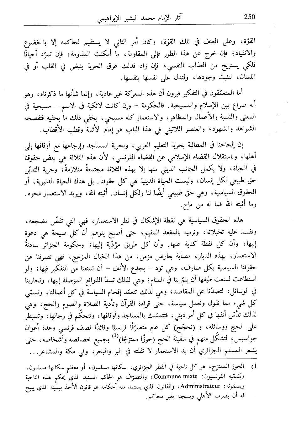 إن إلحاحنا في المطالبة بحرية التعليم العربي، وبحرية المساجد وإرجاعها مع أوقافها إلى أهلها، وباستقلال القضاء الإسلامي عن القضاء الفرنسي، لأن هذه الثلاثة هي بعض حقوقنا في الحياة، ولا يكمل الجانب الديني منها إلا بهذه الثلاثة مجتمعةً متلازمةً؛ وحرية التديّن حق طبيعي لكل إنسان، وليست الحياة الدينية هي كل حقوقنا. بل هناك الحياة الدنيوية، أو الحقوق السياسية، وهي حق طبيعي أيضًا لنا ولكل إنسان. أثبته الله، ويريد الاستعمار محوه. وما أثبته الله فما له من ماح.