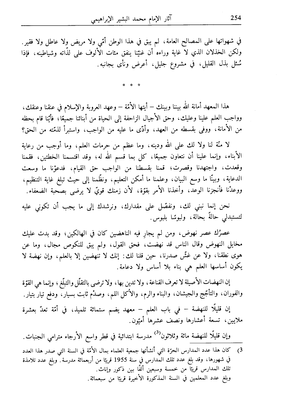 هذا المعهد أمانة الله بيننا وبينك- أيتها الأمّة- وعهد العروبة والإسلام في عنقنا وعنقك، وواجب العلم علينا وعليك، وحق الأجيال الزاحفة إلى الحياة من أبنائنا جميعًا، فأيّنا قام بحظه من الأمانة، ووفى بقسطه من العهد، وأدّى ما عليه من الواجب، واستبرأ لذمّته من الحق؟