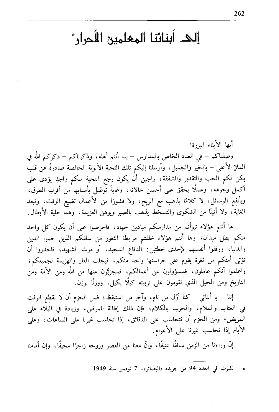 ها أنتم هؤلاء تبوأتم من مدارسكم ميادين جهاد، فاحرصوا على أن يكون كل واحد منكم بطل ميدان، وها أنتم هؤلاء خلفتم مرابطة الثغور من سلفكم الذين حموا الدين والدنيا، ووقفوا أنفسهم لإحدى خطتين: الدفاع المجيد، أو موت الشهيد، فاحذروا أن تؤتى أمتكم من ثغرة يقوم على حراستها واحد منكم، فيجلب العار والهزيمة لجميعكم، واعلموا أنكم عاملون، فمسؤولون عن أعمالكم، فمجزيُّون عنها من الله ومن الأمة ومن التاريخ ومن الجيل الذي تقومون على تربيته كيلًا بكيل، ووزنًا بوزن.