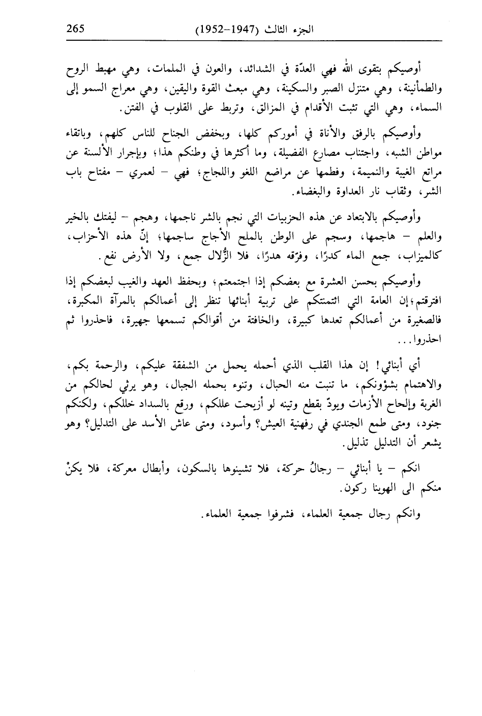 أي أبنائي! إن هذا القلب الذي أحمله يحمل من الشفقة عليكم، والرحمة بكم، والاهتمام بشؤونكم، ما تنبت منه الحبال، وتنوء بحمله الجبال، وهو يرثي لحالكم من الغربة وإلحاح الأزمات ويودّ بقطع وتينه لو أزيحت عللكم، ورقع بالسداد خللكم، ولكنكم جنود، ومتى طمع الجندي في رفهنية العيش؟ وأسود، ومتى عاش الأسد على التدليل؟ وهو يشعر أن التدليل تذليل.