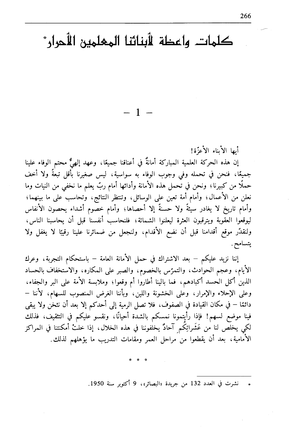 * نشرت في العدد 132 من جريدة «البصائر»، 9 أكتوبر سنة 1950.