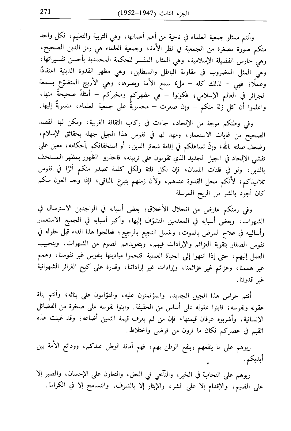 وأنتم ممثلو جمعية العلماء في ناحية من أهم أعمالها، وهي التربية والتعليم، فكل واحد منكم صورة مصغرة من الجمعية في نظر الأمة، وجمعية العلماء هي رمز الدين الصحيح، وهي حارس الفضيلة الإسلامية، وهي المثال المفسر للحكمة المحمدية بأحسن تفسيراتها، وهي المثل المضروب في مقاومة الباطل والمبطلين، وهي مظهر القدوة الدينية اعتقادًا وعملًا؛ فهي- لذلك كله- ملءُ سمع الأمة وبصرها، وهي الأريج المتضوّع بسمعة الجزائر في العالم الإسلامي، فكونوا- في مظهركم ومخبركم- أمثلةً صحيحةً منها، واعلموا أن كل زلة منكم- وإن صغرت- محسوبةٌ على جمعية العلماء، منسوبةٌ إليها.