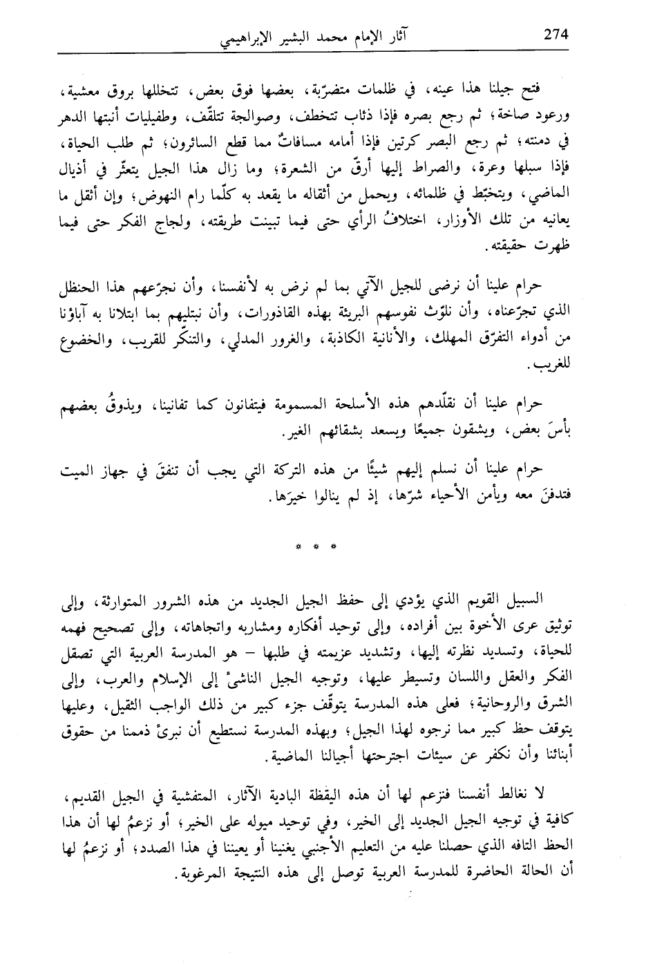 السبيل القويم الذي يؤدي إلى حفظ الجيل الجديد من هذه الشرور المتوارثة، وإلى توثيق عرى الأخوة بين أفراده، وإلى توحيد أفكاره ومشاربه واتجاهاته، وإلى تصحيح فهمه للحياة، وتسديد نظرته إليها، وتشديد عزيمته في طلبها- هو المدرسة العربية التي تصقل الفكر والعقل واللسان وتسيطر عليها، وتوجيه الجيل الناشئ إلى الإسلام والعرب، وإلى الشرق والروحانية، فعلى هذه المدرسة يتوقّف جزء كبير من ذلك الواجب الثقيل، وعليها يتوقف حظ كبير مما نرجوه لهذا الجيل؛ وبهذه المدرسة نستطيع أن نبرئ ذممنا من حقوق أبنائنا وأن نكفر عن سيئات اجترحتها أجيالنا الماضية.