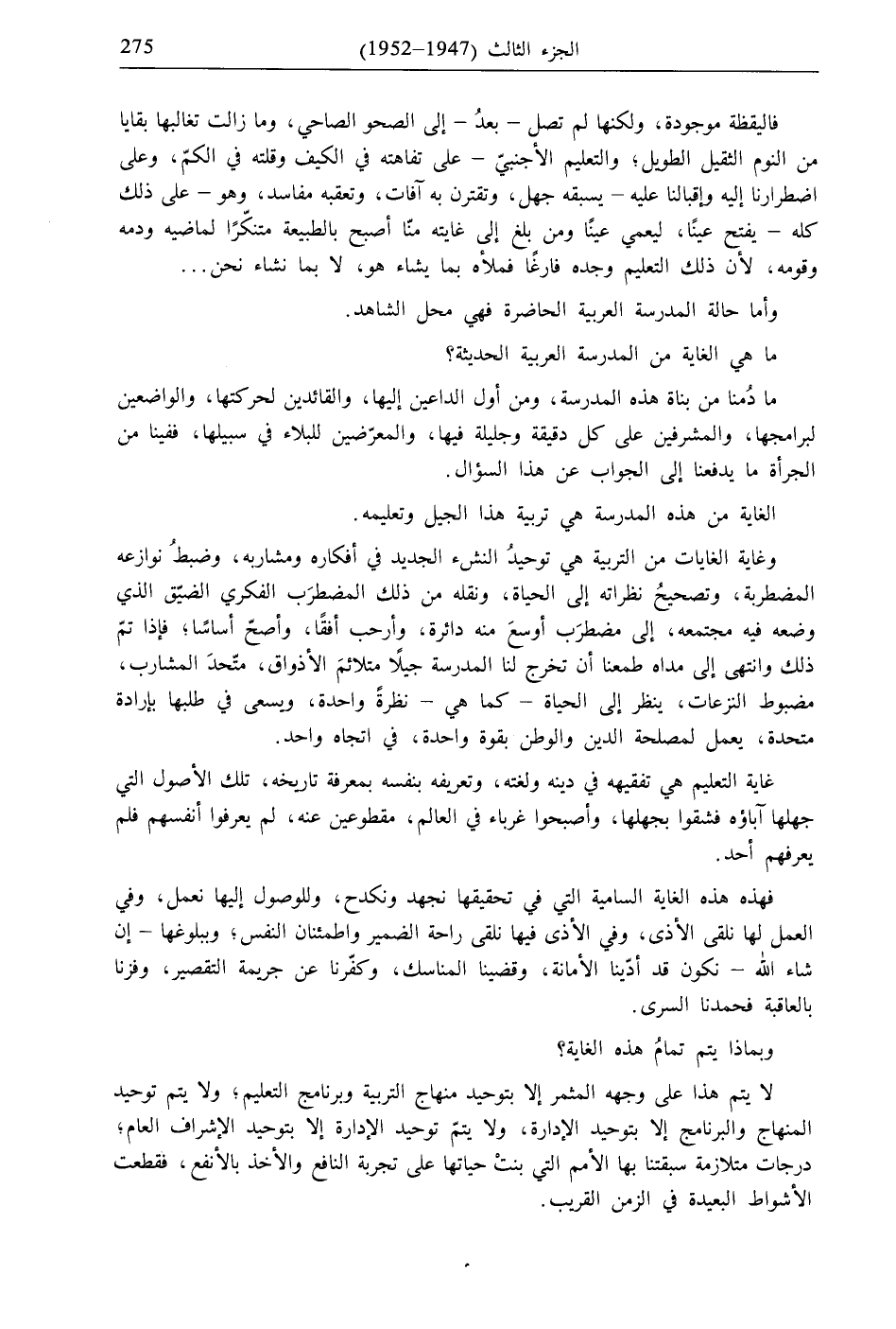 وغاية الغايات من التربية هي توحيدُ النشء الجديد في أفكاره ومشاربه، وضبط نوازعه المضطربة، وتصحيحُ نظراته إلى الحياة، ونقله من ذلك المضطرَب الفكري الضيّق الذي وضعه فيه مجتمعه، إلى مضطرَب أوسعَ منه دائرة، وأرحب أفقًا، وأصحّ أساسًا، فإذا تمّ ذلك وانتهى إلى مداه طمعنا أن تخرج لنا المدرسة جيلًا متلائمَ الأذواق، متّحدَ المشارب، مضبوط النزعات، ينظر إلى الحياة- كما هي- نظرةً واحدة، ويسعى في طلبها بإرادة متحدة، يعمل لمصلحة الدين والوطن بقوة واحدة، في اتجاه واحد.