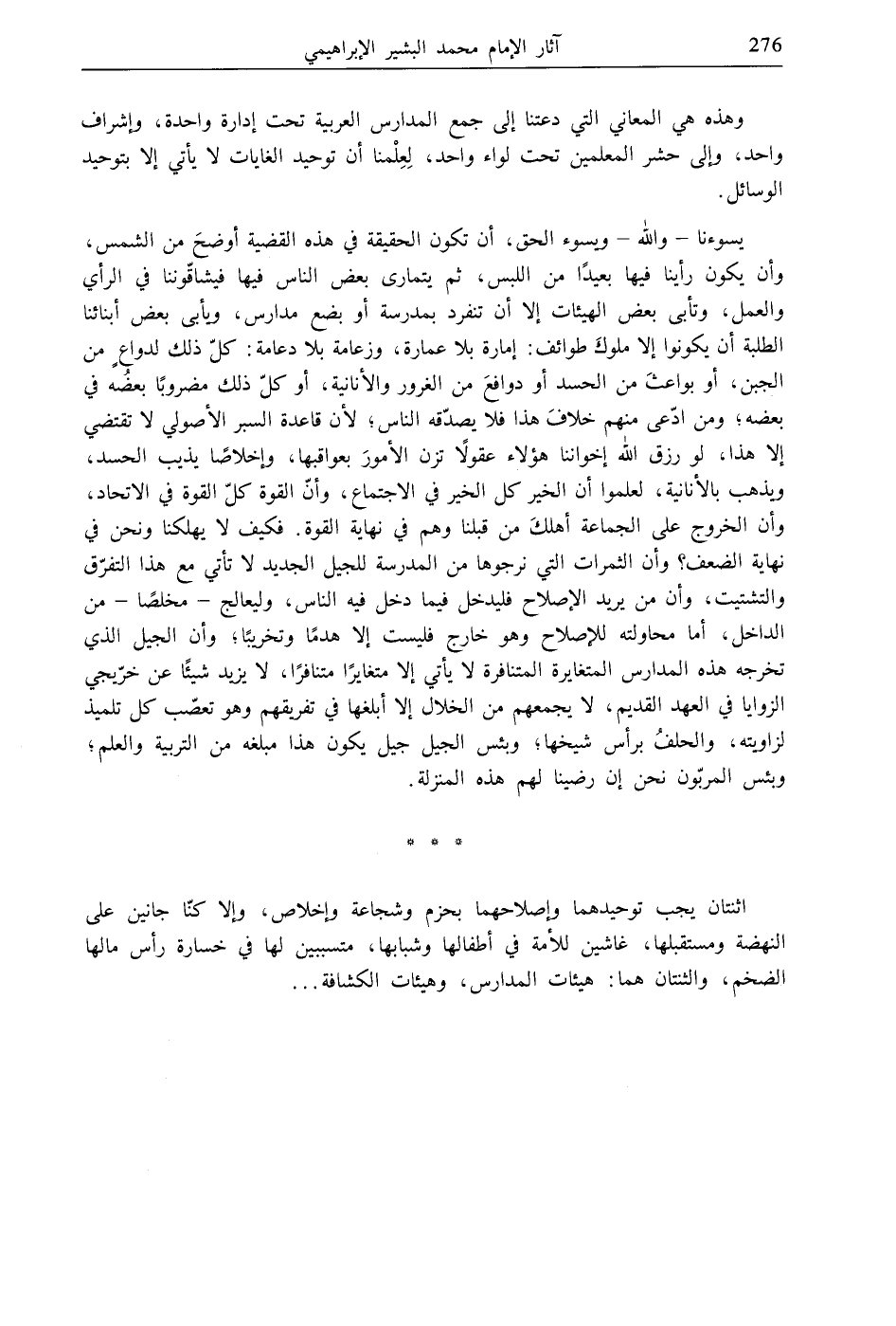 اثنتان يجب توحيدهما وإصلاحهما بحزم وشجاعة وإخلاص، وإلا كنّا جانين على النهضة ومستقبلها، غاشين للأمة في أطفالها وشبابها، متسببين لها في خسارة رأس مالها الضخم، والثنتان هما: هيئات المدارس، وهيئات الكشافة ...