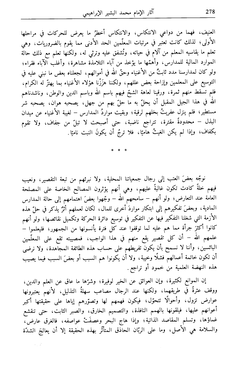 نوجّه بعضَ العتب إلى رجال جمعياتنا المحلية، ولا نبرئهم من تبعة التقصير، ونعيب فيهم خلةً كادت تكون غالبةً عليهم، وهي أنهم يؤثرون المصالح الخاصة على المصلحة العامة عند التعارض، ولو أنهم- سامحهم الله- وجّهوا بعضَ اهتمامهم إلى حالة المدارس المادية، وبعضَ تفكيرهم إلى ابتكار مواردَ أخرى للمال، لكان لعملهم أثرٌ يذكر في حلّ هذه الأزمة التي شغلنا التفكير فيها عن التفكير في توسيع دائرة الحركة وتكميل نقائصها، ولو أنهم كانوا أكثرَ جرأة مما هم عليه لما توقفوا عند كل فترة يأنسونها من الجمهور؛ فليعلموا- علمهم الله- أن كل تقصير يقع منهم في هذا الواجب، فمصيبته تقع على المعلّمين البائسين، وأننا لا نسمح بأن يكون تفريطهم على حساب هذه الطائفة المجاهدة، ولا نرضى أن تكون خاتمة أعمالهم فشلًا وخيبة، ولا أن يكونوا هم السبب أو بعضَ السبب فيما يصيب هذه النهضة العلمية من خمود أو تراجع.