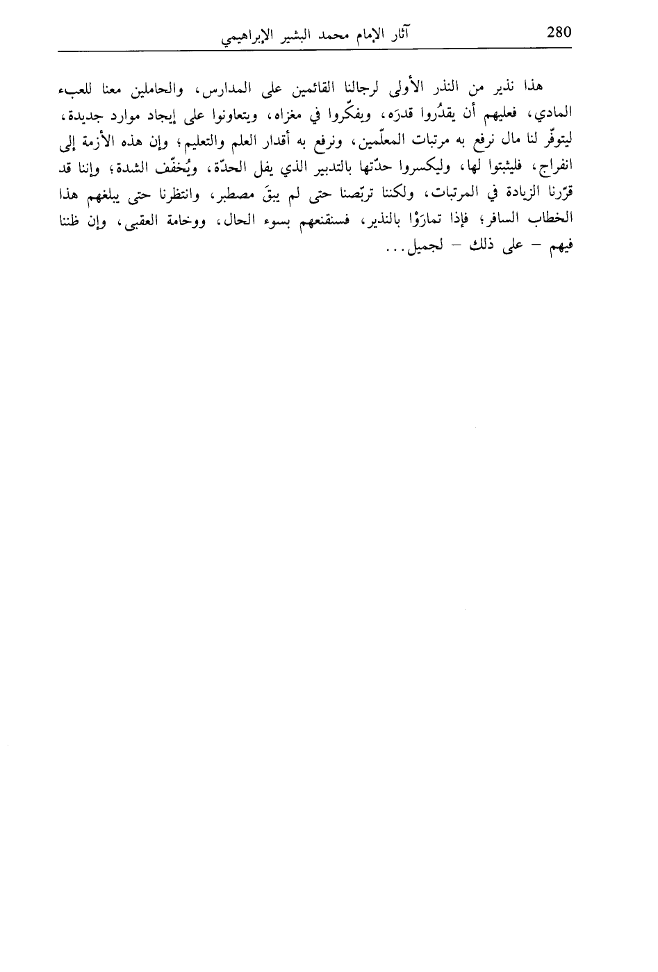 هذا نذير من النذر الأولى لرجالنا القائمين على المدارس، والحاملين معنا للعبء المادي، فعليهم أن يقدُروا قدرَه، ويفكّروا في مغزاه، ويتعاونوا على إيجاد موارد جديدة، ليتوفّر لنا مال نرفع به مرتبات المعلّمين، ونرفع به أقدار العلم والتعليم؛ وإن هذه الأزمة إلى انفراج، فليثبتوا لها، وليكسروا حدّتها بالتدبير الذي يفل الحدّة، ويخفّف الشدة، وإننا قد قرّرنا الريادة في المرتبات، ولكننا تربّصنا حتى لم يبقَ مصطبر، وانتظرنا حتى يبلغهم هذا الخطاب السافر، فإذا تمارَوْا بالنذير، فسنقنعهم بسوء الحال، ووخامة العقبى، وإن ظننا فيهم- على ذلك- لجميل ...