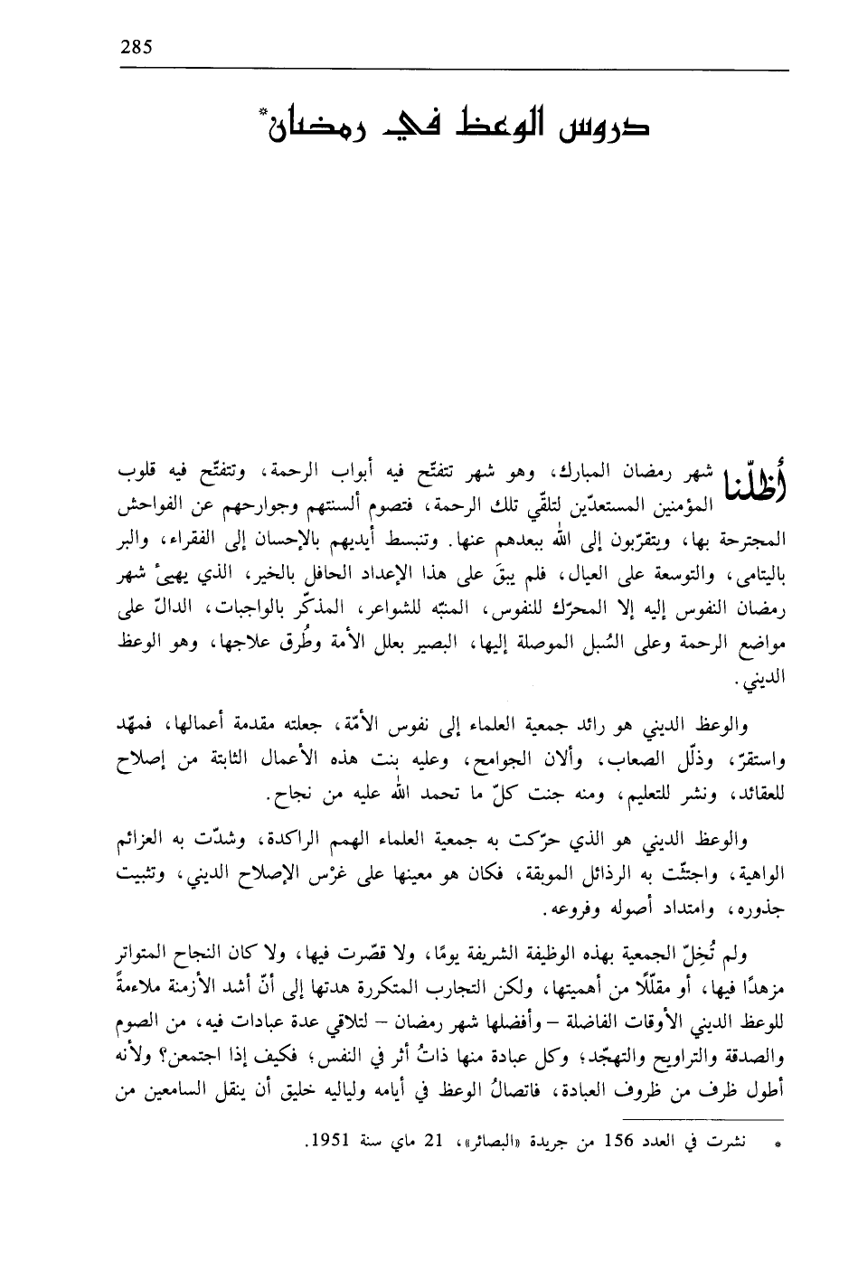 * نشرت في العدد 156 من جريدة «البصائر»، 21 ماي سنة 1951.