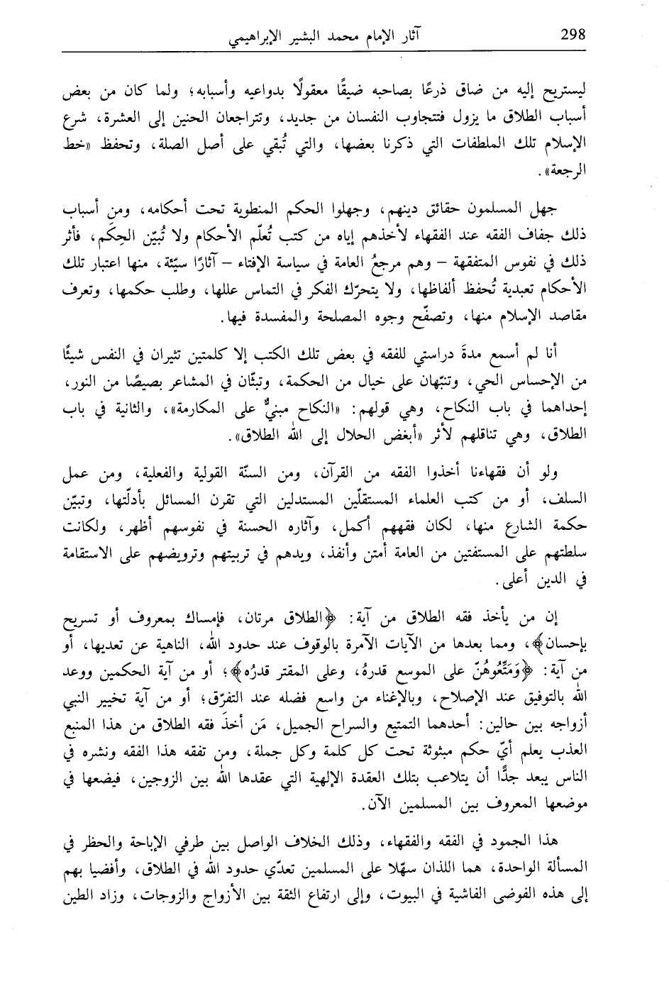 أنا لم أسمع مدةَ دراستي للفقه في بعض تلك الكتب إلا كلمتين تثيران في النفس شيئًا من الإحساس الحي، وتنبّهان على خيال من الحكمة، وتبثّان في المشاعر بصيصًا من النور، إحداهما في باب النكاح، وهي قولهم: "النكاح مبنيٌّ على المكارمة"، والثانية في باب الطلاق، وهي تناقلهم لأثر "أبغض الحلال إلى الله الطلاق ".