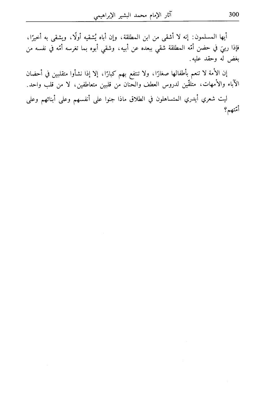أيها المسلمون: إنه لا أشقى من ابن المطلقة، وإن أباه يُشقيه أولًا، ويشقى به أخيرًا، فإذا ربيَ في حضن أمّه المطلقة شقي ببعده عن أبيه، وشقي أبوه بما تغرسه أمّه في نفسه من بغض له وحقد عليه.