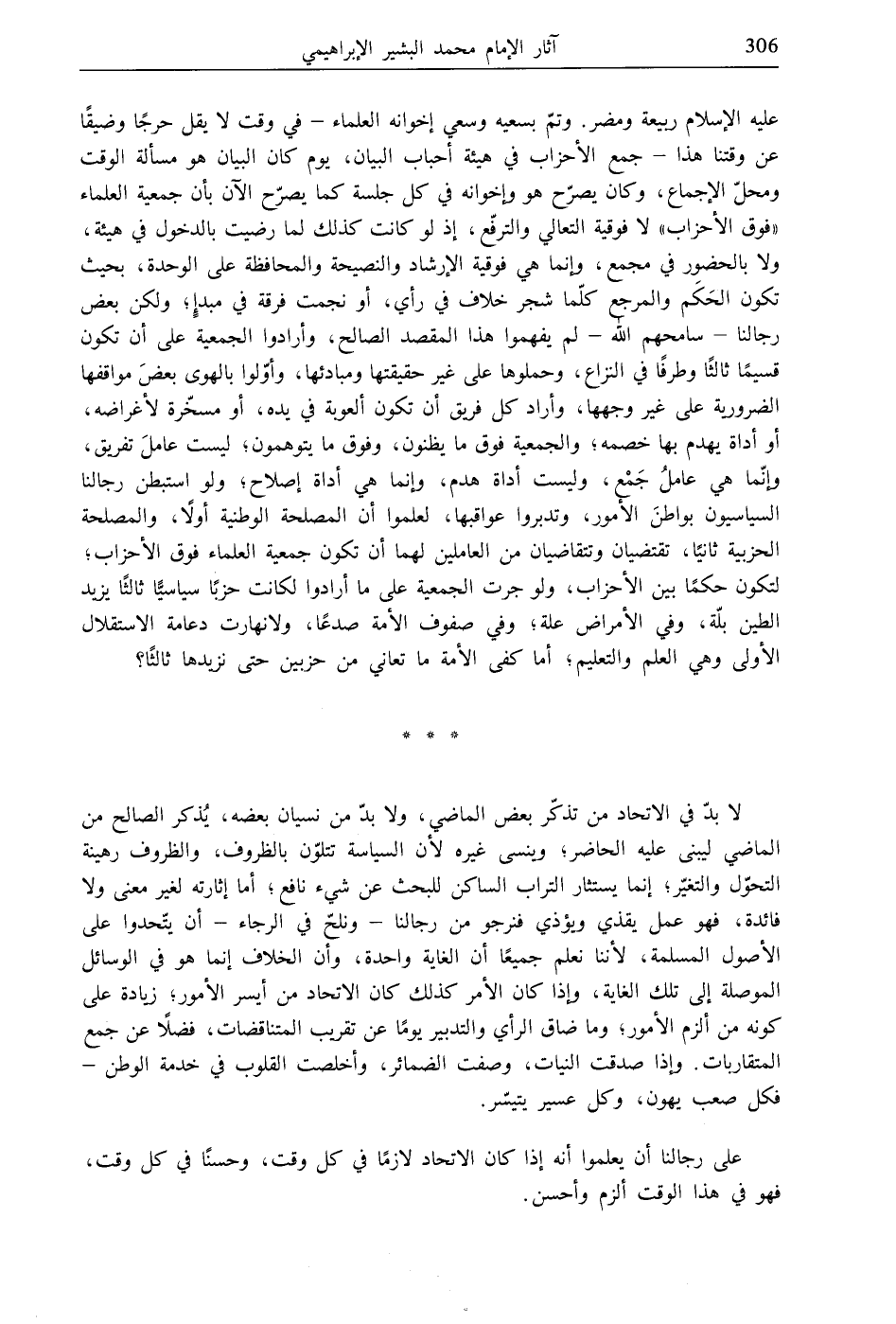 عليه الإسلام ربيعة ومضر. وتمّ بسعيه وسعي إخوانه العلماء- في وقت لا يقل حرجًا وضيقًا عن وقتنا هذا- جمع الأحزاب في هيئة أحباب البيان، يوم كان البيان هو مسألة الوقت ومحلّ الإجماع، وكان يصرّح هو وإخوانه في كل جلسة كما يصرّح الآن بأن جمعية العلماء "فوق الأحزاب" لا فوقية التعالي والترفّع، إذ لو كانت كذلك لما رضيت بالدخول في هيئة، ولا بالحضور في مجمع، وإنما هي فوقية الإرشاد والنصيحة والمحافظة على الوحدة، بحيث تكون الحَكَم والمرجع كلّما شجر خلاف في رأي، أو نجمت فرقة في مبدإٍ، ولكن بعض رجالنا- سامحهم الله- لم يفهموا هذا المقصد الصالح، وأرادوا الجمعية على أن تكون قسيمًا ثالثًا وطرفًا في النزاع، وحملوها على غير حقيقتها ومبادئها، وأوّلوا بالهوى بعضَ مواقفها الضرورية على غير وجهها، وأراد كل فريق أن تكون ألعوبة في يده، أو مسخّرة لأغراضه، أو أداة يهدم بها خصمه، والجمعية فوق ما يظنون، وفوق ما يتوهمون، ليست عاملَ تفريق، وإنّما هي عامل جَمْع، وليست أداة هدم، وإنما هي أداة إصلاح، ولو استبطن رجالنا السياسيون بواطنَ الأمور، وتدبروا عواقبها، لعلموا أن المصلحة الوطنية أولًا، والمصلحة الحزبية ثانيًا، تقتضيان وتتقاضيان من العاملين لهما أن تكون جمعية العلماء فوق الأحزاب، لتكون حكمًا بين الأحزاب، ولو جرت الجمعية على ما أرادوا لكانت حزبًا سياسيًّا ثالثًا يزيد الطين بلّة، وفي الأمراض علة؛ وفي صفوف الأمة صدعًا، ولانهارت دعامة الاستقلال الأولى وهي العلم والتعليم، أما كفى الأمة ما تعاني من حزبين حتى نزيدها ثالثًا؟