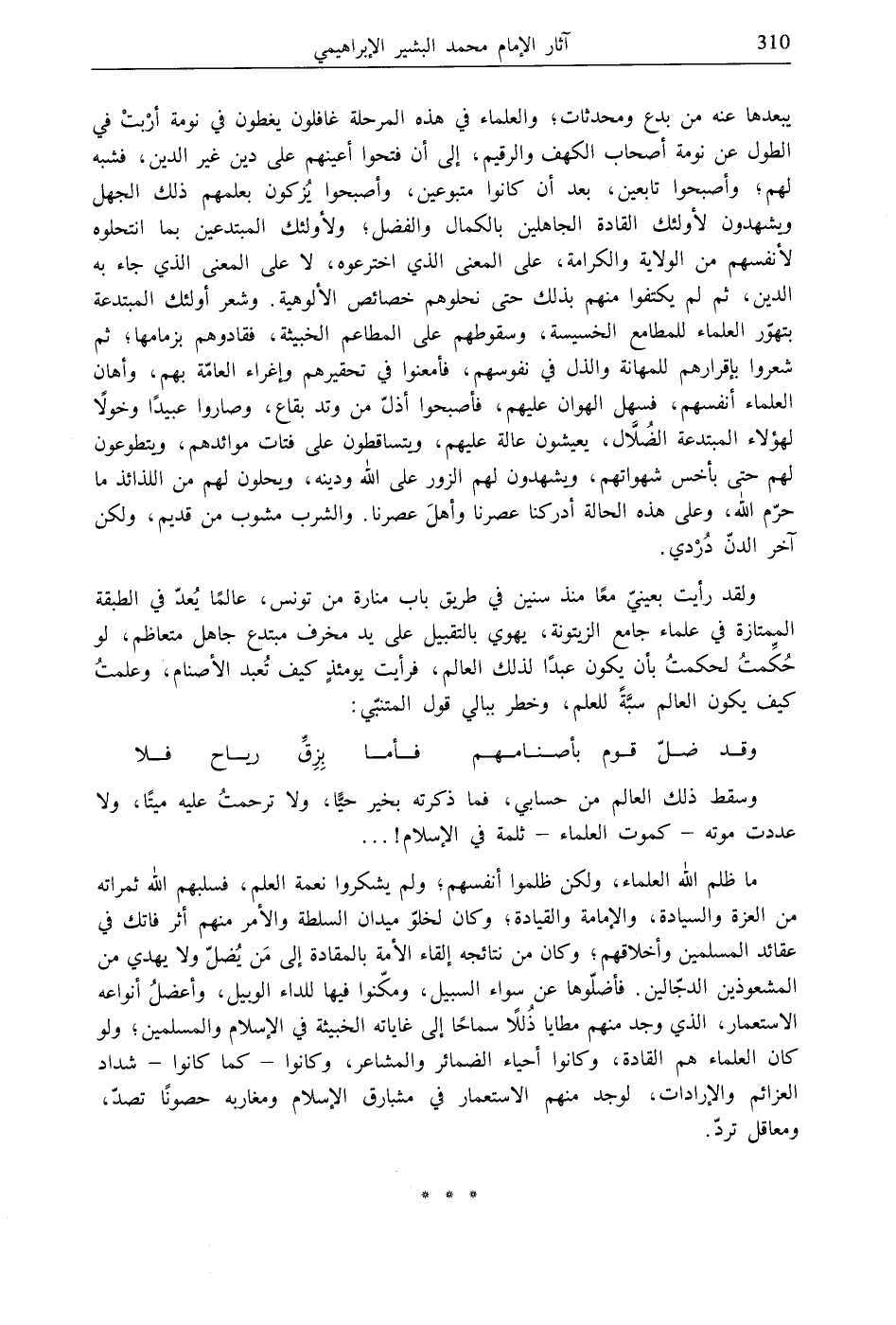 ولقد رأيت بعينيّ معًا منذ سنين في طريق باب منارة من تونس، عالمًا يُعدّ في الطبقة الممتازة في علماء جامع الزيتونة، يهوي بالتقبيل على يد مخرف مبتدع جاهل متعاظم، لو حُكِّمتُ لحكمتُ بأن يكون عبدًا لذلك العالم، فرأيت يومئذٍ كيف تُعبد الأصنام، وعلمتُ كيف يكون العالم سبَّةً للعلم، وخطر ببالي قول المتنبّي: