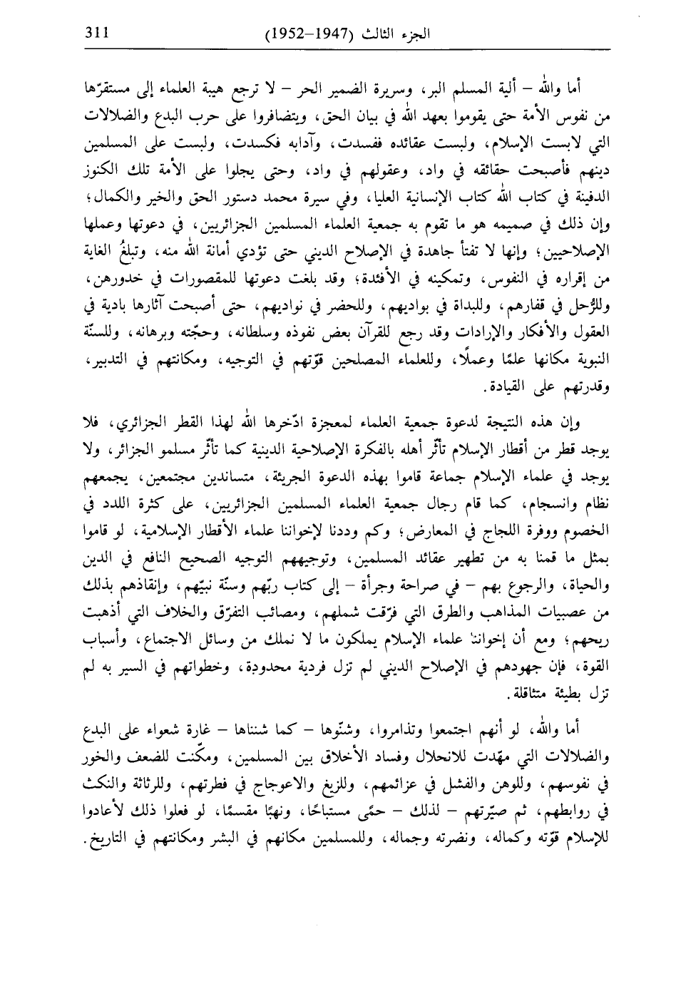 وإن هذه النتيجة لدعوة جمعية العلماء لمعجزة ادّخرها الله لهذا القطر الجزائري، فلا يوجد قطر من أقطار الإسلام تأثّر أهله بالفكرة الإصلاحية الدينية كما تأثّر مسلمو الجزائر، ولا يوجد في علماء الإسلام جماعة قاموا بهذه الدعوة الجريئة، متساندين مجتمعين، يجمعهم نظام وانسجام، كما قام رجال جمعية العلماء المسلمين الجزائريين، على كثرة اللدد في الخصوم ووفرة اللجاج في المعارض؛ وكم وددنا لإخواننا علماء الأقطار الإسلامية، لو قاموا بمثل ما قمنا به من تطهير عقائد المسلمين، وتوجيههم التوجيه الصحيح النافع في الدين والحياة، والرجوع بهم- في صراحة وجرأة- إلى كتاب ربّهم وسنّة نبيّهم، وإنقاذهم بذلك من عصبيات المذاهب والطرق التي فرّقت شملهم، ومصائب التفرّق والخلاف التي أذهبت ريحهم؛ ومع أن إخواننا علماء الإسلام يملكون ما لا نملك من وسائل الاجتماع، وأسباب القوة، فإن جهودهم في الإصلاح الديني لم تزل فردية محدودة، وخطواتهم في السير به لم تزل بطيئة متثاقلة.