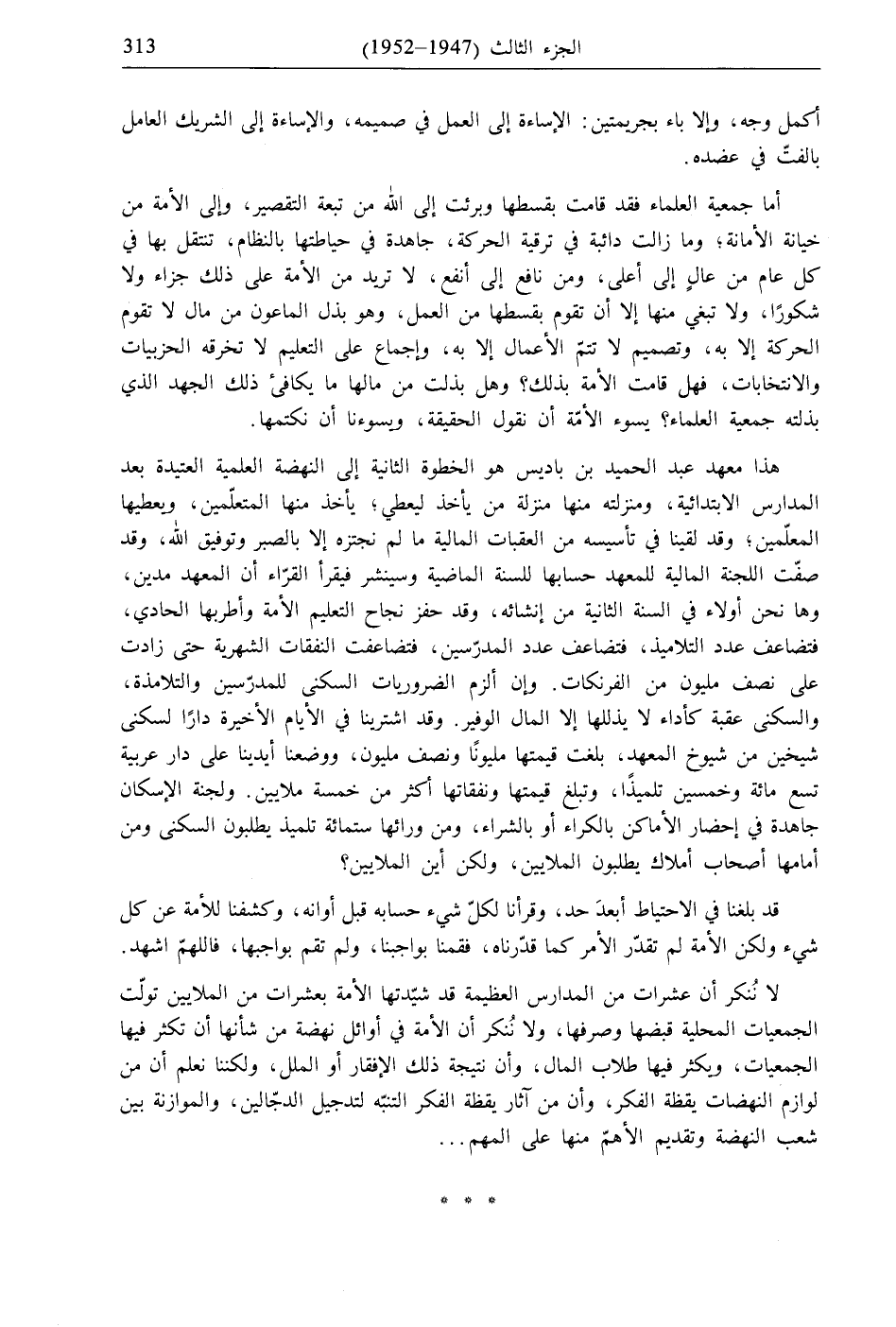 أما جمعية العلماء فقد قامت بقسطها وبرئت إلى الله من تبعة التقصير، وإلى الأمة من خيانة الأمانة، وما زالت دائبة في ترقية الحركة، جاهدة في حياطتها بالنظام، تنتقل بها في كل عام من عالٍ إلى أعلى، ومن نافع إلى أنفع، لا تريد من الأمة على ذلك جزاء ولا شكورًا، ولا تبغي منها إلا أن تقوم بقسطها من العمل، وهو بذل الماعون من مال لا تقوم الحركة إلا به، وتصميم لا تتمّ الأعمال إلا به، وإجماع على التعليم لا تخرقه الحزبيات والانتخابات، فهل قامت الأمة بذلك؟ وهل بذلت من مالها ما يكافئ ذلك الجهد الذي بذلته جمعية العلماء؟ يسوء الأمّة أن نقول الحقيقة، ويسوءنا أن نكتمها.