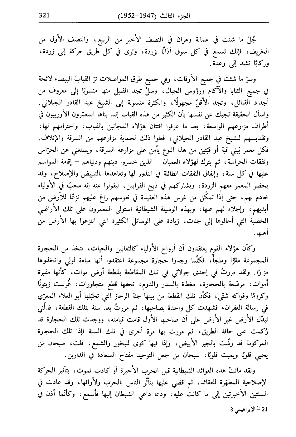 وكأن هؤلاء القوم يعتقدون أن أرواح الأولياء كالثعابين والحيات، تتخذ من الحجارة المجموعة مقرًّا وملجأً، فكلّما وجدوا حجارة مجموعة اعتقدوا أنها مباءة لولي واتخذوها مزازًا. ولقد مررتُ في إحدى جولاتي في تلك المقاطعة بقطعة أرض موات، كأنها مقبرة أموات، مرصّعة بالحجارة، مغطاة بالسدر والدوم، تحفها قطع متجاورات، غُرست زيتونًا وكرومًا وفواكه شتّى، فكأن تلك القطعة من بينها جنة الرجاز التي تخيّلها أبو العلاء المعرّي في رسالة الغفران؛ فشهدت كل واحدة بصاحبها، ثم مررتُ بعد سنة بتلك القطعة، فدلّني تبدّل الأرض غير الأرض على أن صاحبها الأول قامت قيامته، ووجدت تلك الحجارة قد رُكمت على حافة الطريق، ثم مررت بها مرة أخرى في تلك السنة فإذا تلك الحجارة المركومة قد رشّت بالجير الأبيض، وإذا فيها كوى للبخور والشمع، قلت، سبحان من يحي قلوبًا ويميت قلوبًا، سبحان من جعل التوحيد مفتاح السعادة في الدارين.