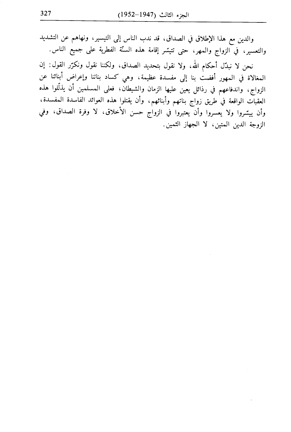 والدين مع هذا الإطلاق في الصداق، قد ندب الناس إلى التيسير، ونهاهم عن التشديد والتعسير، في الزواج والمهر، حتى تتيسّر إقامة هذه السنّة الفطرية على جميع الناس. نحن لا نبدّل أحكام الله، ولا نقول بتحديد الصداق، ولكننا نقول ونكرّر القول: إن المغالاة في المهور أفضت بنا إلى مفسدة عظيمة، وهي كساد بناتنا وإعراض أبنائنا عن الزواج، واندفاعهم في رذائل يعين عليها الزمان والشيطان، فعلى المسلمين أن يذلّلوا هذه العقبات الواقعة في طريق زواج بناتهم وأبنائهم، وأن يقتلوا هذه العوائد الفاسدة المفسدة، وأن ييسّروا ولا يعسروا وأن يعتبروا في الزواج حسن الأخلاق، لا وفرة الصداق، وفي الزوجة الدين المتين، لا الجهاز الثمين.