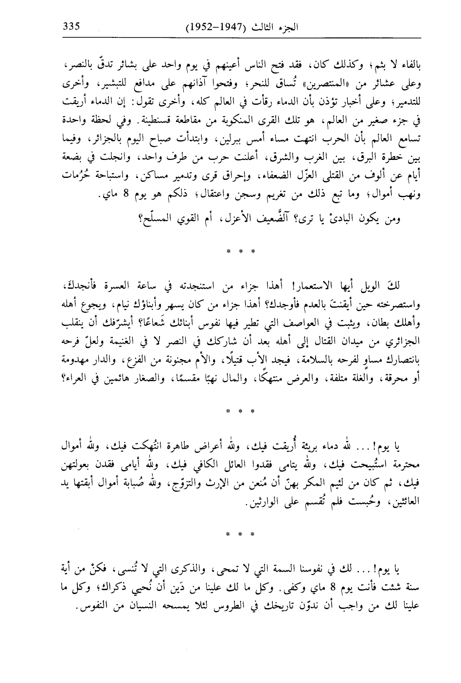 بالفاء لا بثم، وكَذلك كان، فقد فتح الناس أعينهم في يوم واحد على بشائر تدقّ بالنصر، وعلى عشائر من "المنتصرين" تُساق للنحر؛ وفتحوا آذانهم على مدافع للتبشير، وأخرى للتدمير، وعلى أخبار تؤذن بأن الدماء رقأت في العالم كله، وأخرى تقول: إن الدماء أريقت في جزء صغير من العالم، هو تلك القرى المنكوبة من مقاطعة قسنطينة. وفي لحظة واحدة تسامع العالم بأن الحرب انتهت مساء أمس ببرلين، وابتدأت صباح اليوم بالجزائر، وفيما بين خطرة البرق، بين الغرب والشرق، أعلنت حرب من طرف واحد، وانجلت في بضعة أيام عن ألوف من القتلى العزّل الضعفاء، وإحراق قرى وتدمير مساكن، واستباحة حُرُمات ونهب أموال، وما تبع ذلك من تغريم وسجن واعتقال؛ ذلكم هو يوم 8 ماي.