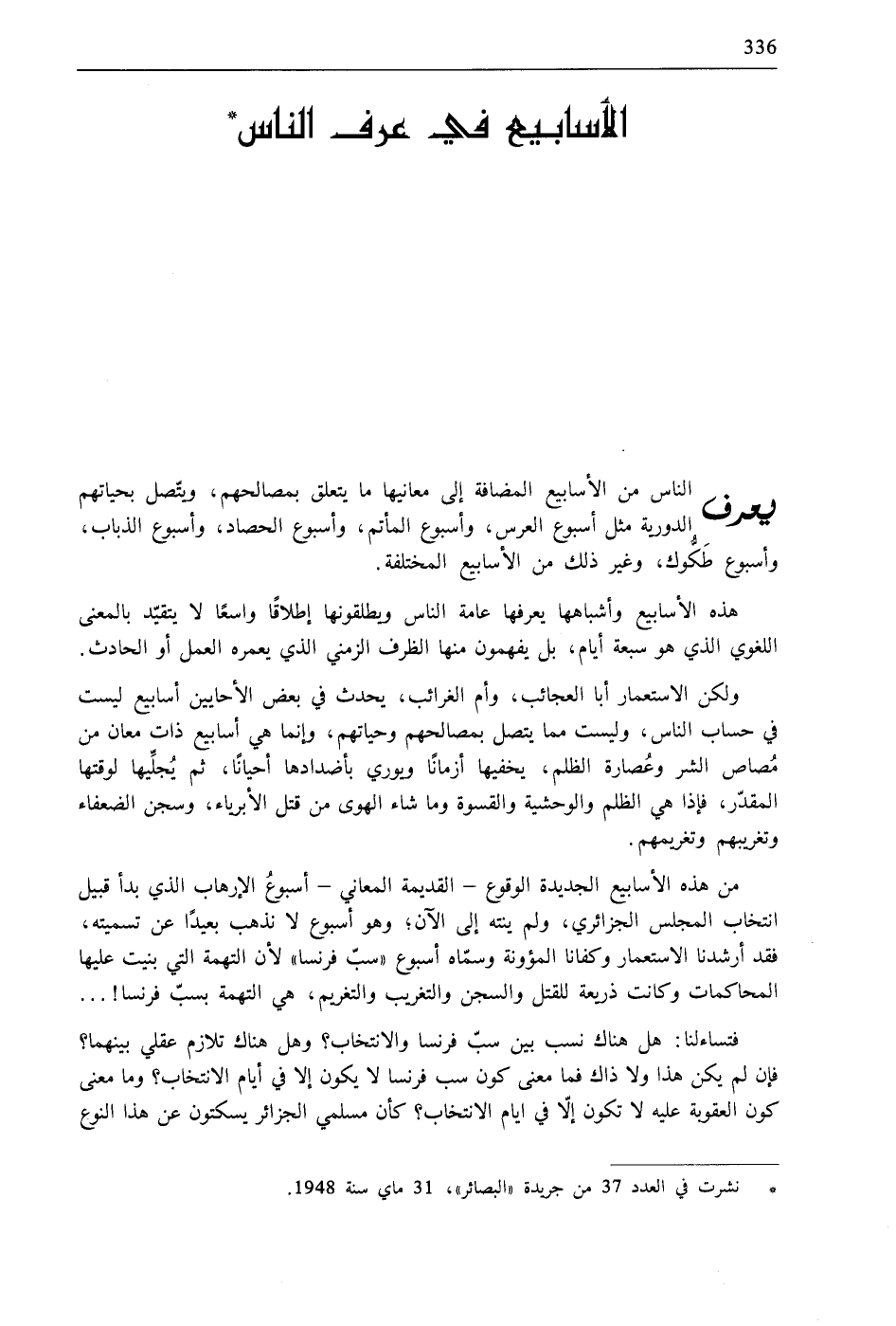* نشرت في العدد 37 من جريدة «البصائر»، 31 ماي سنة 1948.