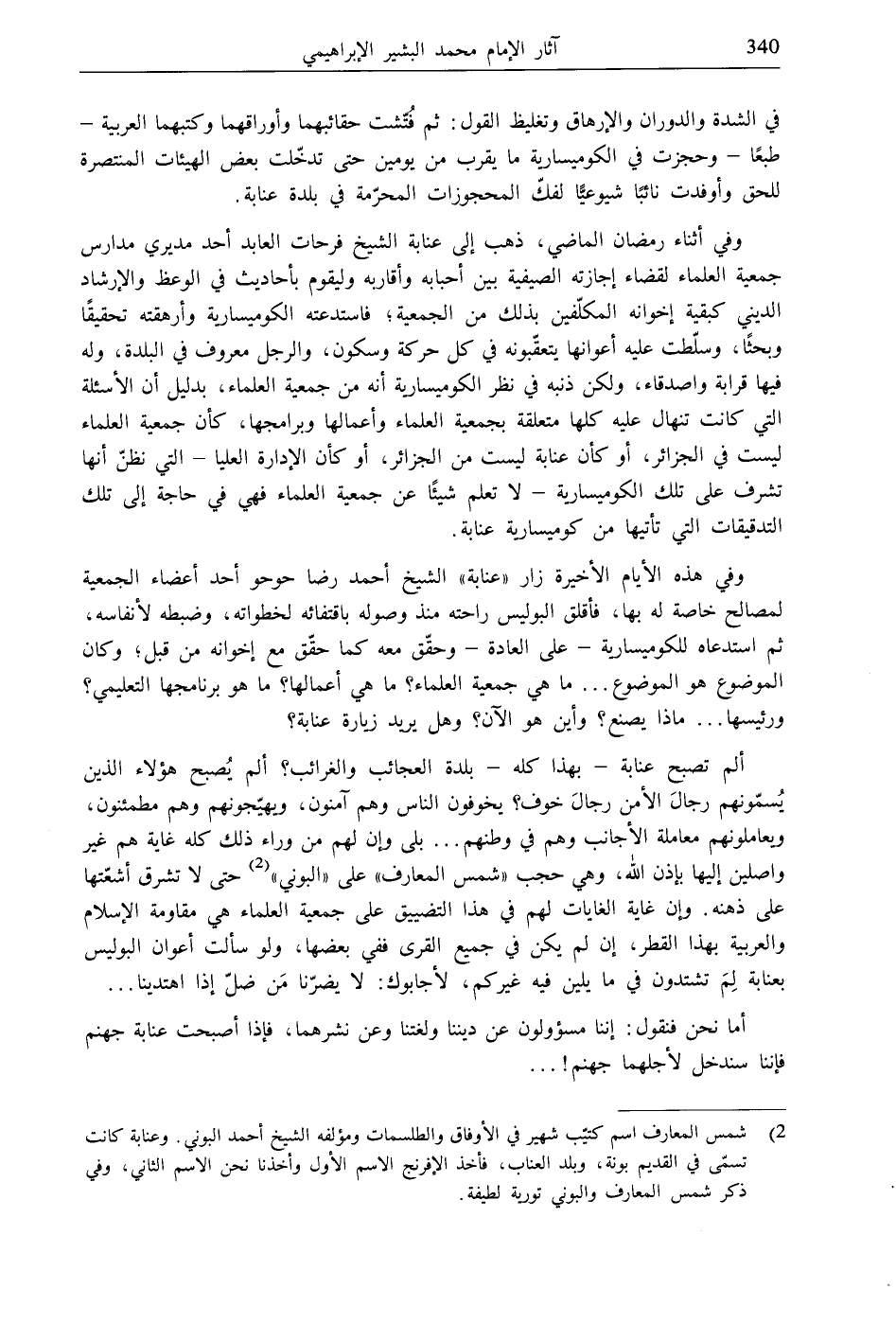 ألم تصبح عنابة- بهذا كله- بلدة العجائب والغرائب؟ ألم يُصبح هؤلاء الذين يُسمّونهم رجالَ الأمن رجالَ خوف؟ يخوفون الناس وهم آمنون، ويهيّجونهم وهم مطمئنون، ويعاملونهم معاملة الأجانب وهم في وطنهم ... بلى وإن لهم من وراء ذلك كله غاية هم غير واصلين إليها بإذن الله، وهي حجب "شمس المعارف" على "البوني" (2) حتى لا تشرق أشعّتها على ذهنه. وإن غاية الغايات لهم في هذا التضييق على جمعية العلماء هي مقاومة الإسلام والعربية بهذا القطر، إن لم يكن في جميع القرى ففي بعضها، ولو سألت أعوان البوليس بعنابة لِمَ تشتدون في ما يلين فيه غيركم، لأجابوك: لا يضرّنا مَن ضلّ إذا اهتدينا ...